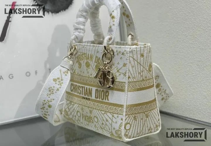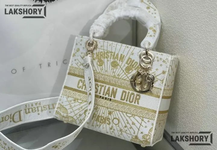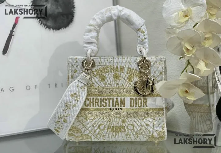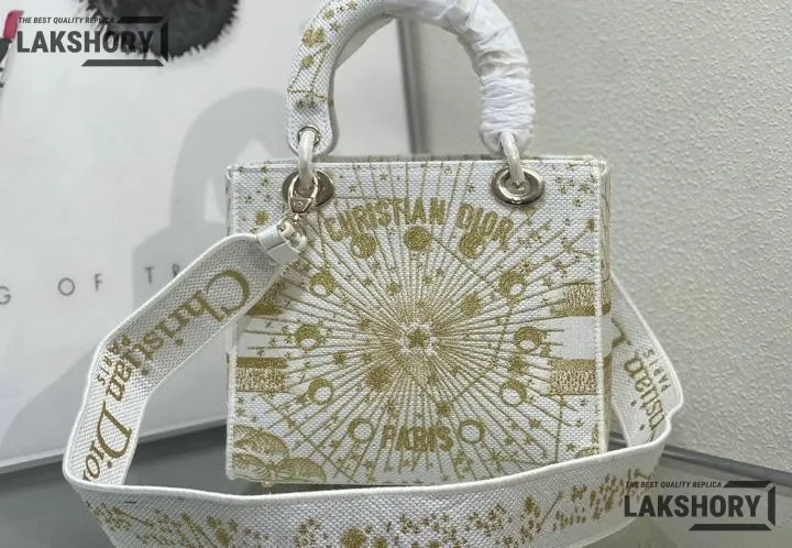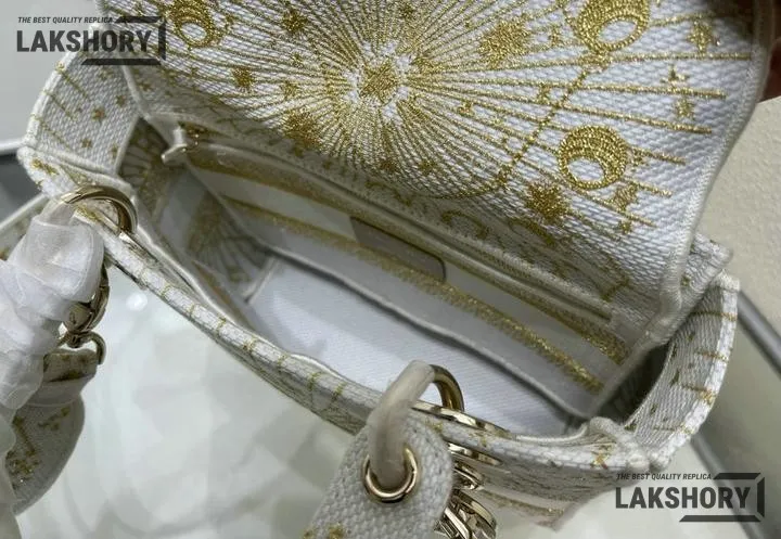 Dior 1:1 Mirror Replica Lady D-Lite Zodiac Embroidered White/Gold 24CM/9.4IN