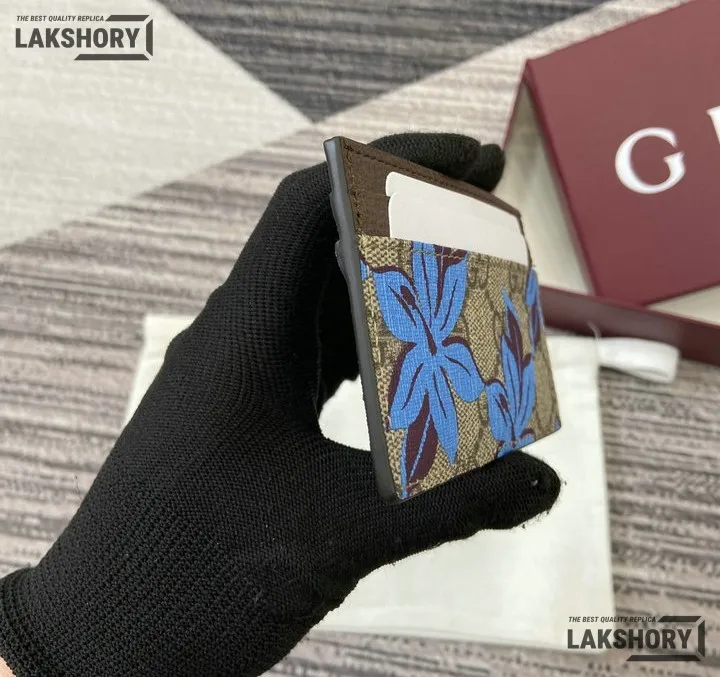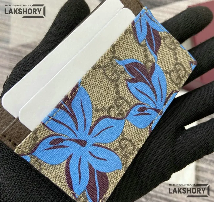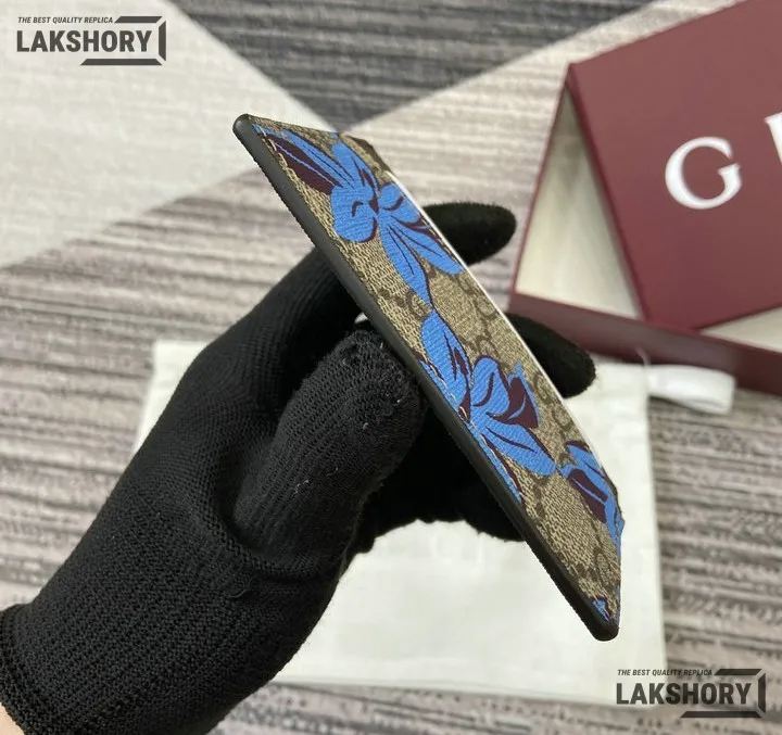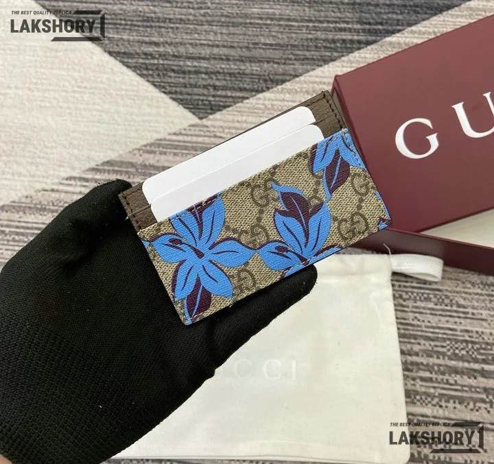 Gucci 1:1 Mirror Replica GG Printed Card Case Wallet Beige Blue 7CM/2.8IN
