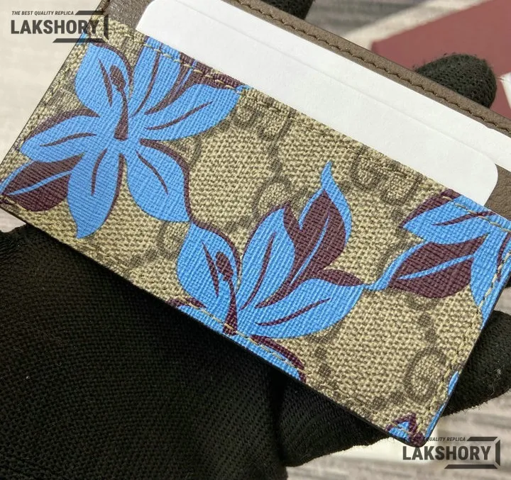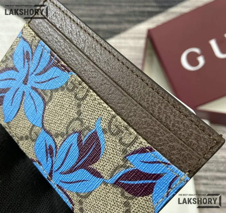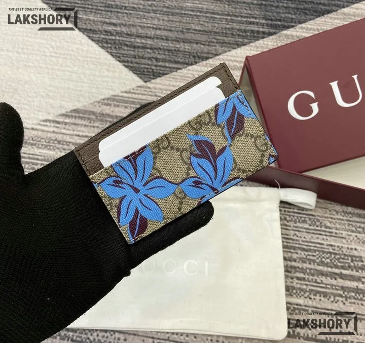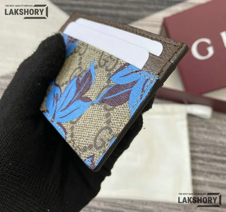 Gucci 1:1 Mirror Replica GG Printed Card Case Wallet Dark Brown Blue 7CM/2.8IN