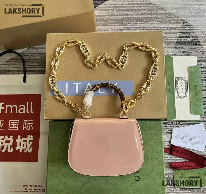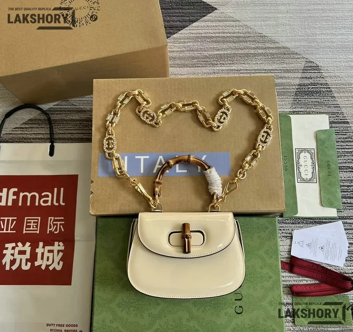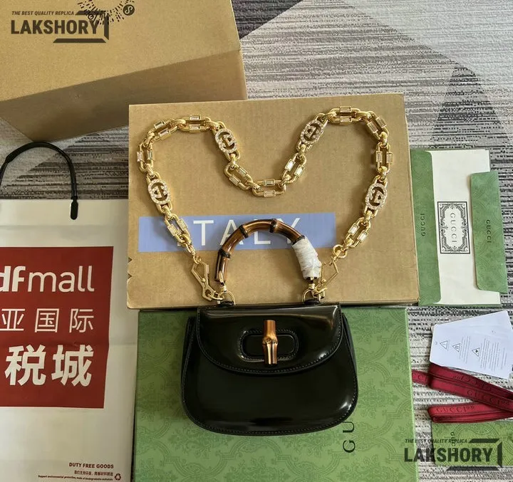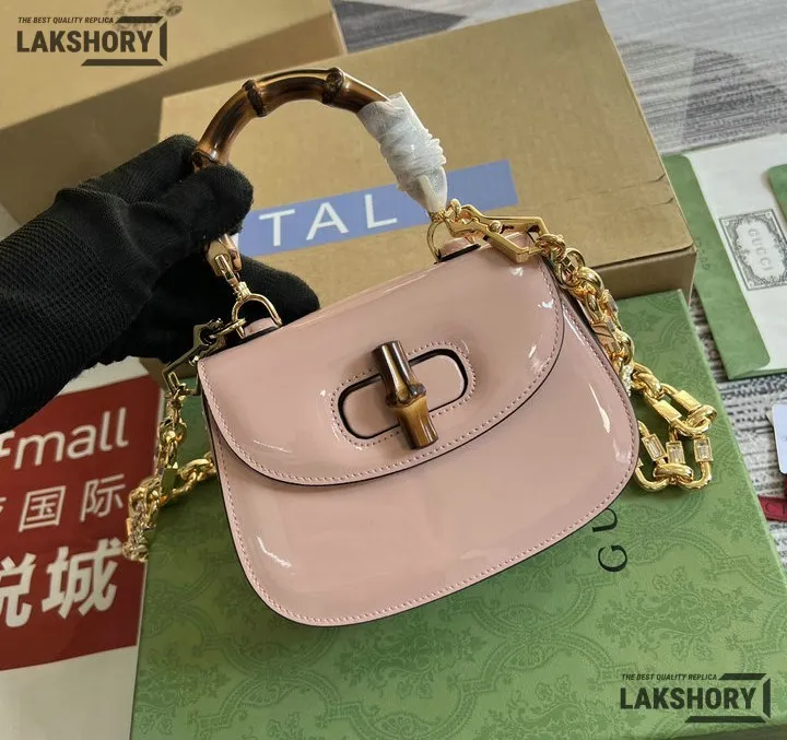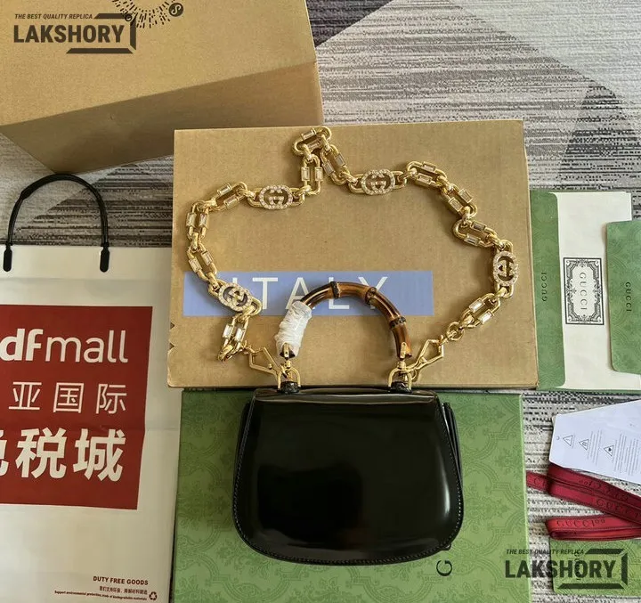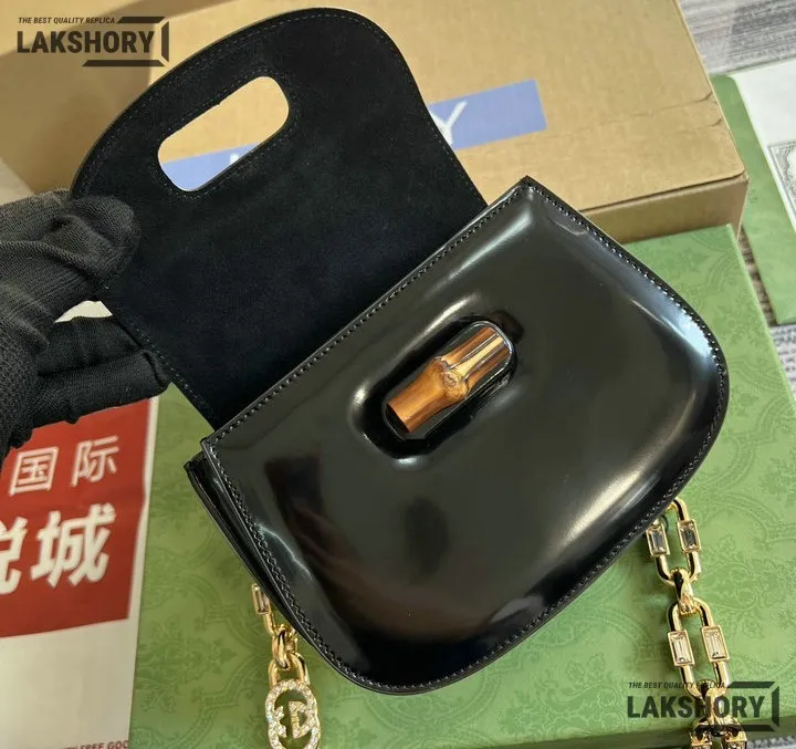 Gucci 1:1 Mirror Replica Patent Crystal Mini Bamboo 1947 Chain Bag 17CM/6.7IN