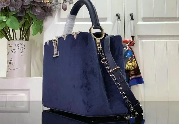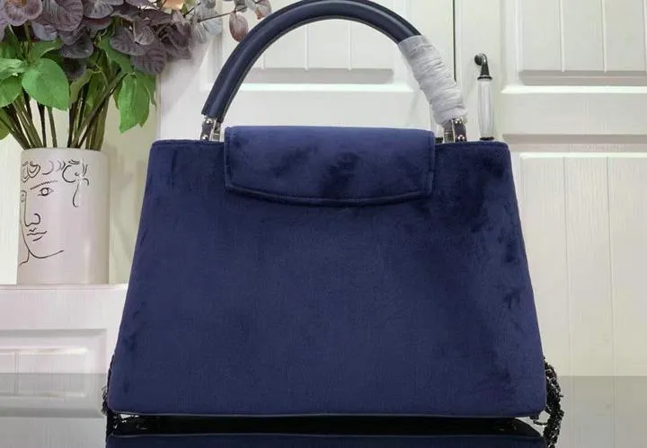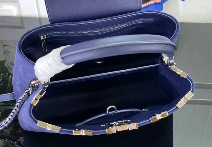 While the exact size is not specified, this replica closely mirrors the proportions of the authentic Blue Capucines Bag, ensuring a comfortable fit when carried on the shoulder. The design offers ample space for essentials, and the strap length is designed for easy, stylish wear throughout the day.