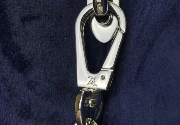 The bag is made from high-quality blue suede, chosen for its resemblance to authentic Louis Vuitton materials and luxurious texture. The hardware, including zippers and clasps, is crafted from durable metal alloys with a polished finish, accurately reflecting the appearance and functionality of the original bag’s components.