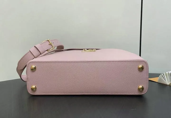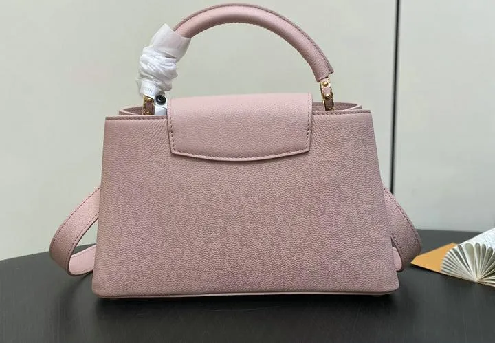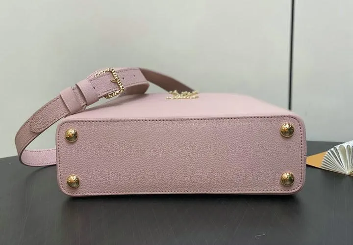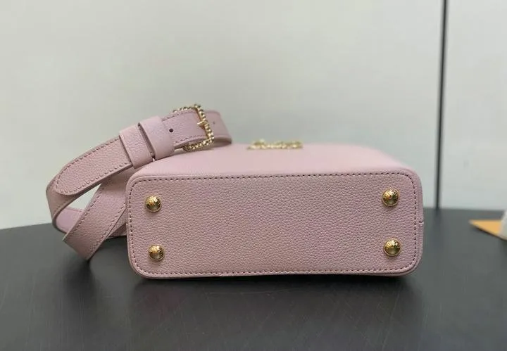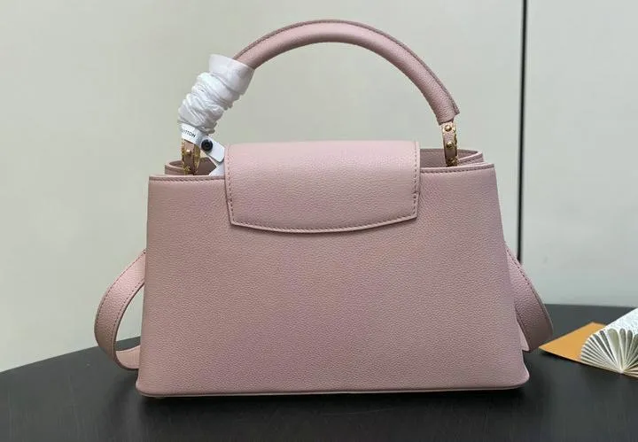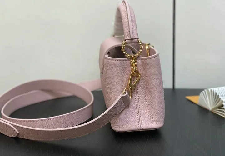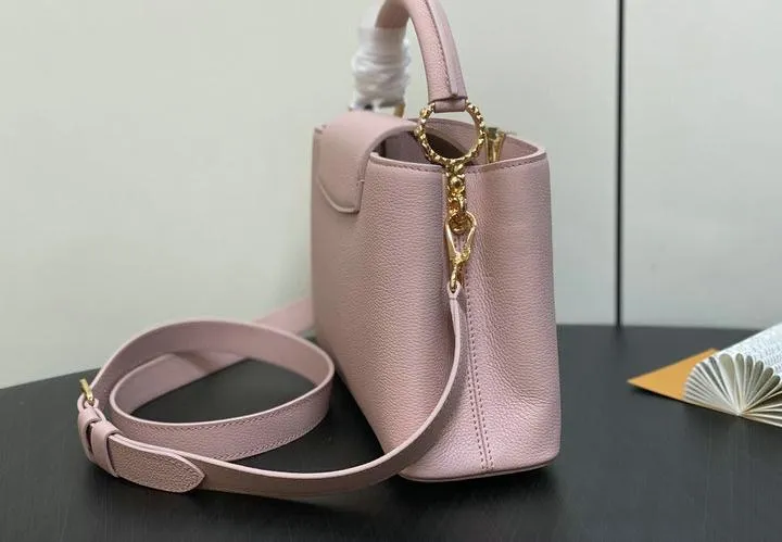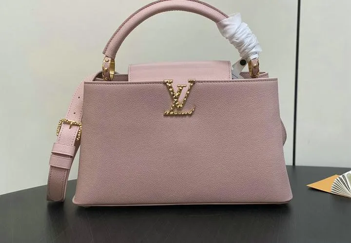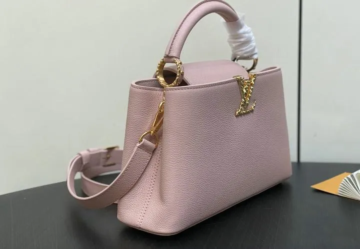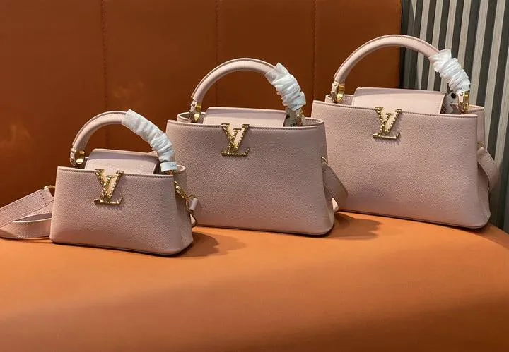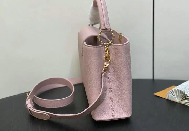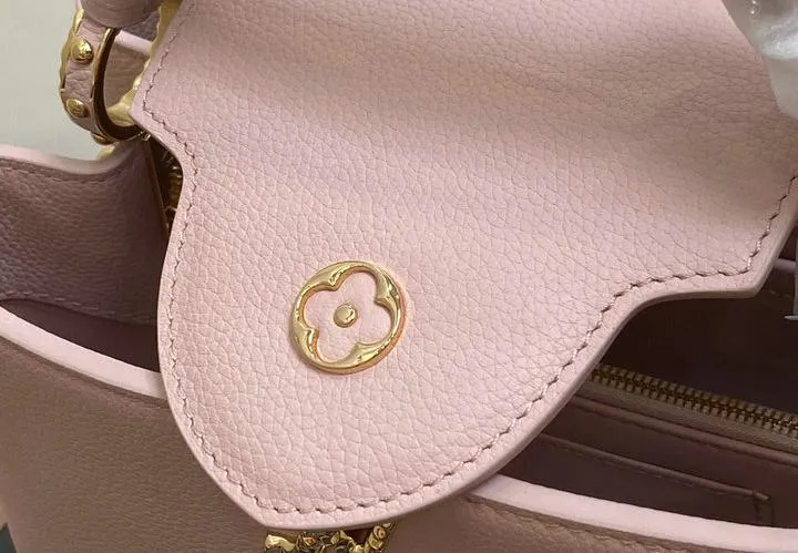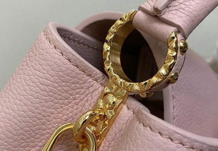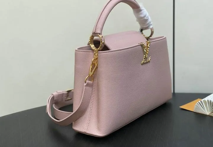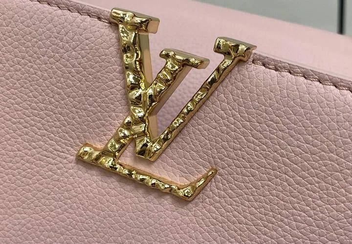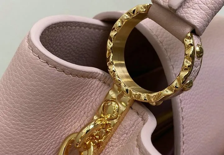 This replica features genuine leather to ensure a luxurious feel and durability, closely matching the original Capucines. The hardware is crafted to resemble the authentic Louis Vuitton finish, including the signature LV logo and gold-toned accents. Attention to detail in both the leather texture and hardware guarantees a premium look and feel.