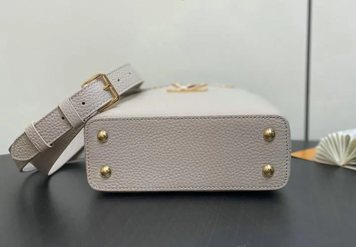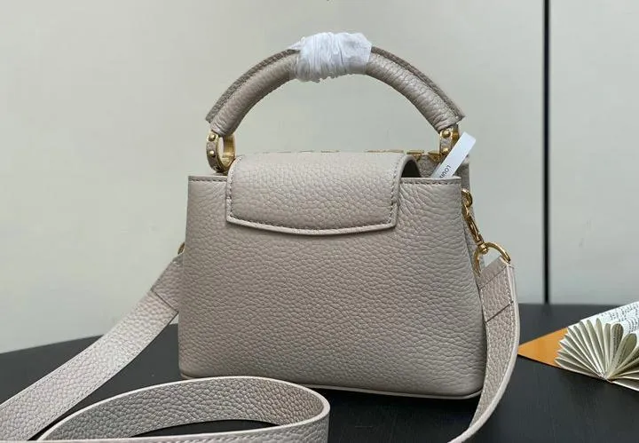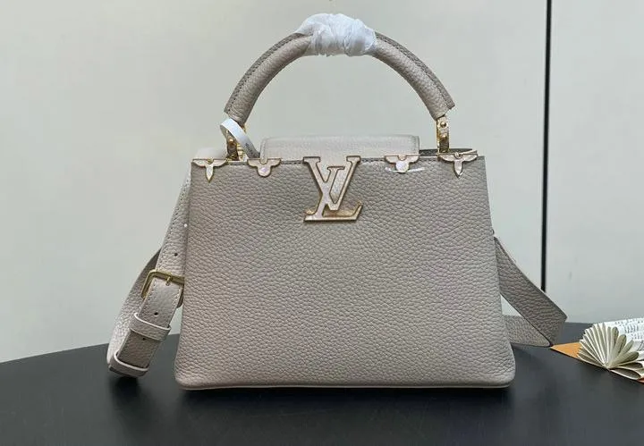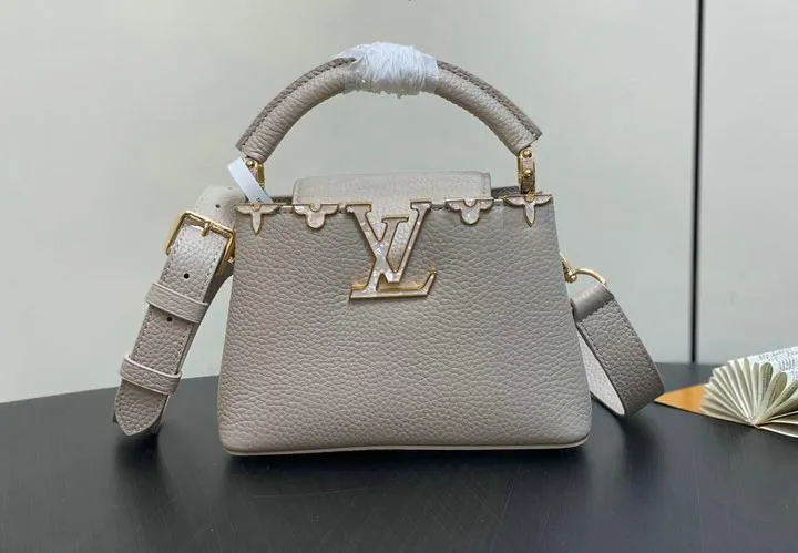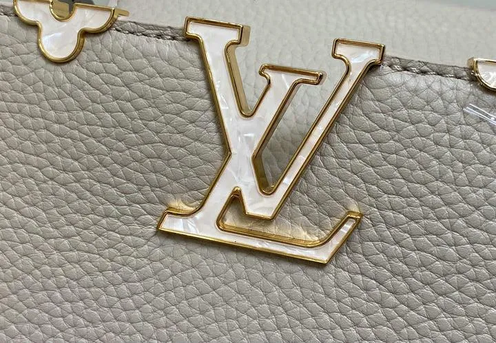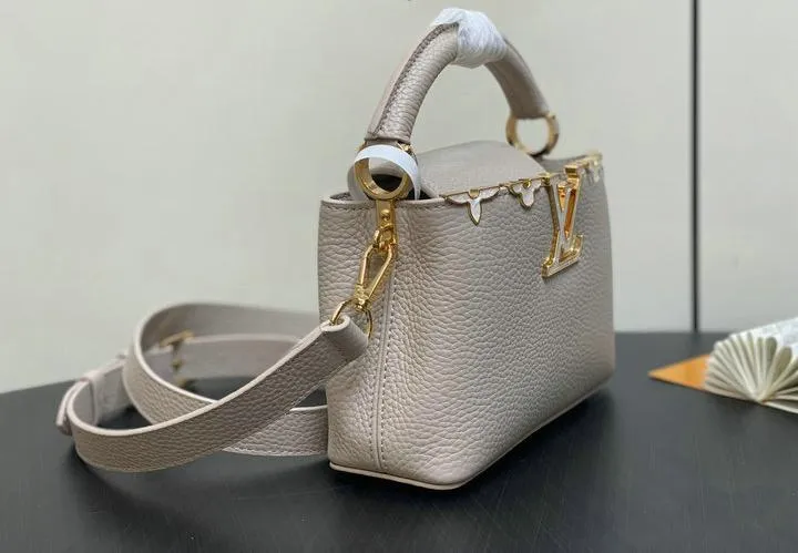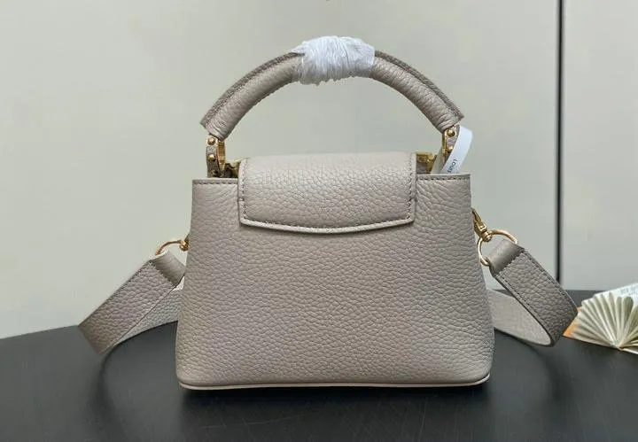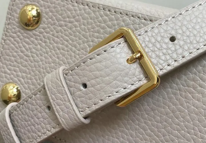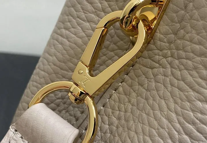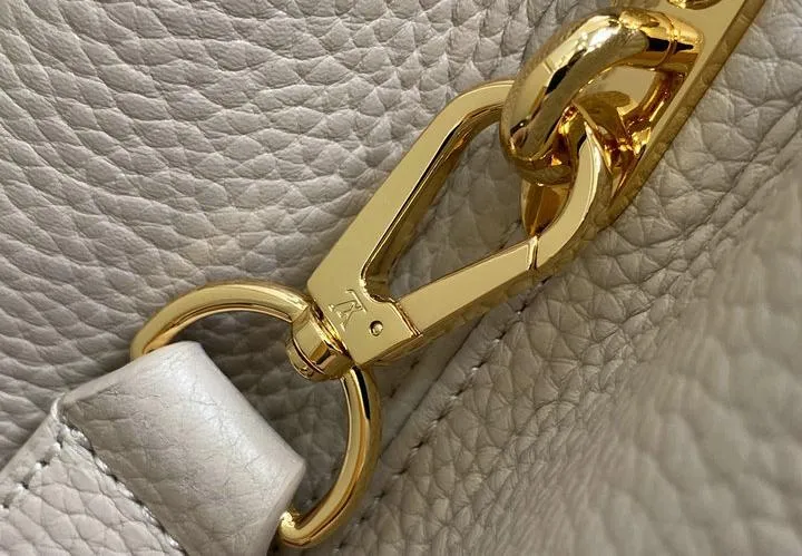 This replica Capucines Mini uses genuine leather to closely replicate the texture and suppleness of the authentic Louis Vuitton bag. The hardware is finished in high-quality polished metal, ensuring durability and a luxurious look. Every element, from the clasps to the logo, is carefully chosen to echo the original’s premium standards.