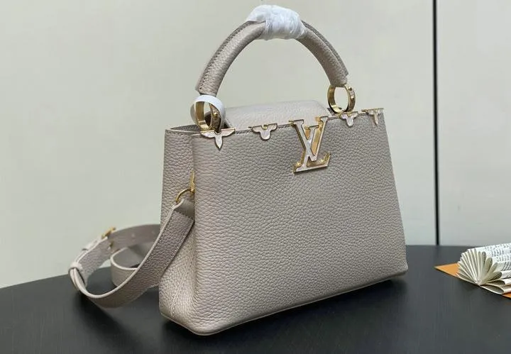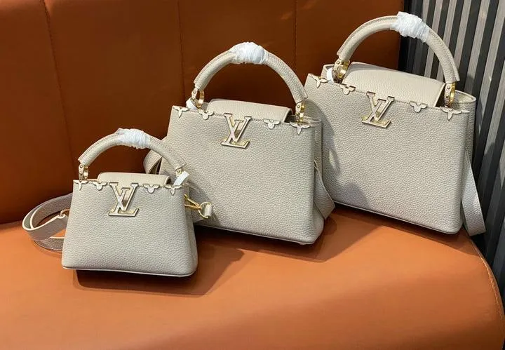 This replica Capucines handle bag typically arrives with premium packaging, closely mimicking the original Louis Vuitton presentation. It generally includes a branded dust bag for storage and protective wrappings for the bag and hardware. The attention to detail extends to the packaging, enhancing the overall luxury unboxing experience.