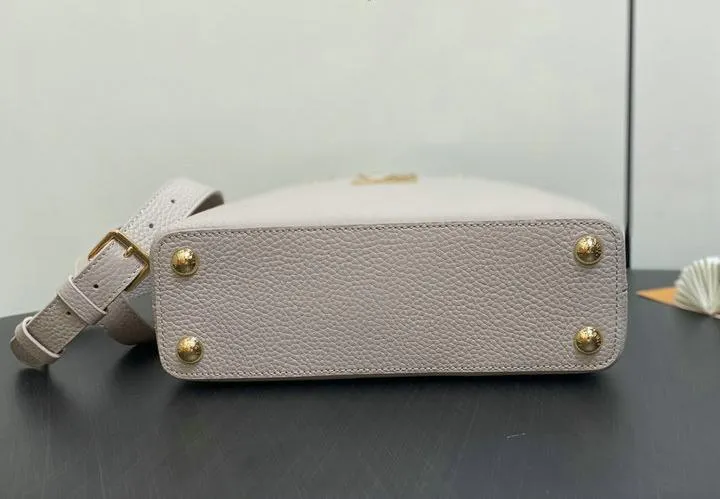 While the exact size is not specified, this replica mirrors the proportions of the original Capucines Mini, designed to be compact yet functional. Its petite dimensions make it perfect for both hand-carry and shoulder wear, offering versatility and elegance. The structured shape ensures it maintains its chic silhouette during use.