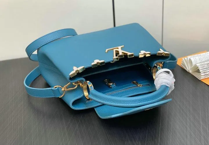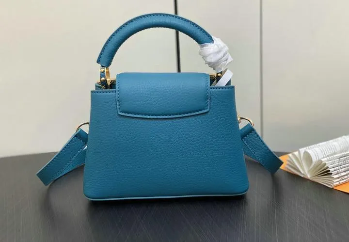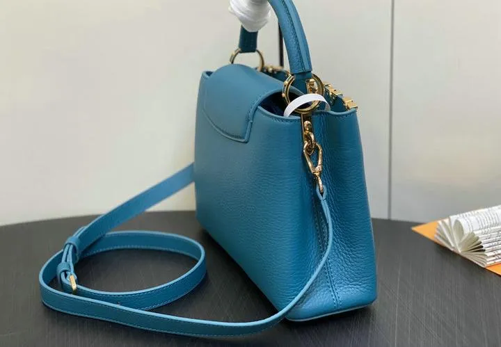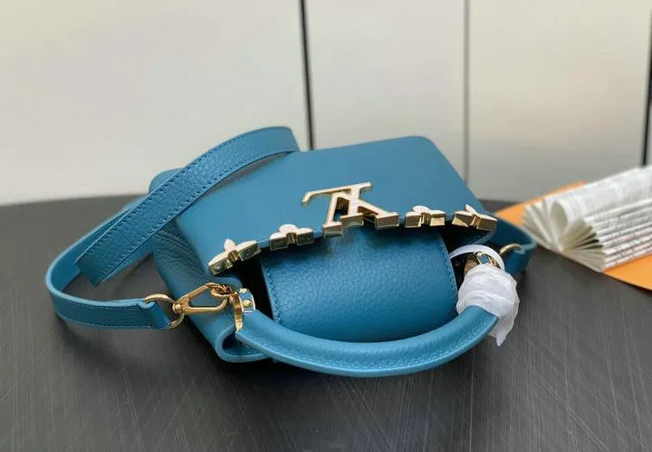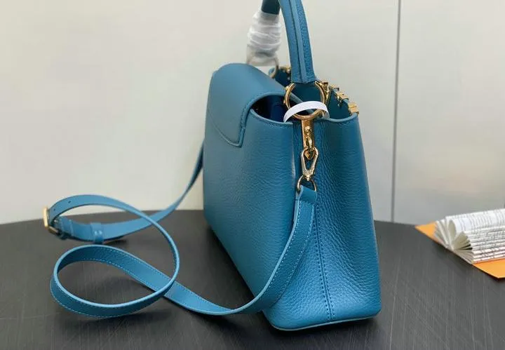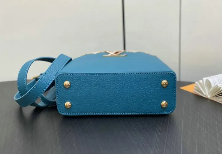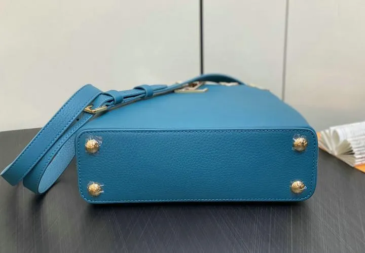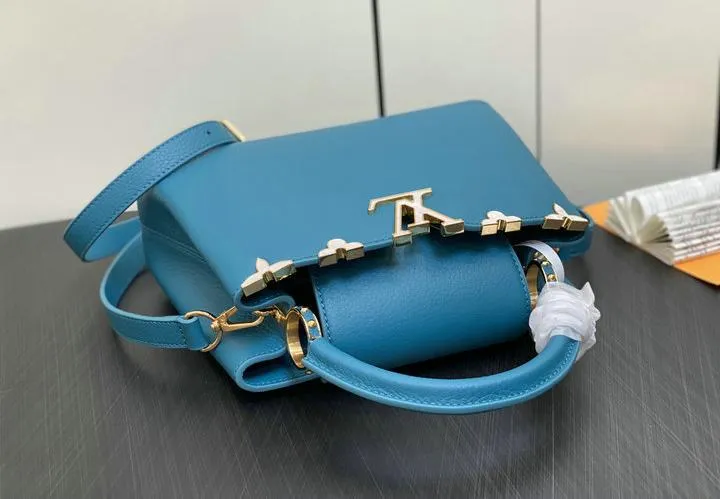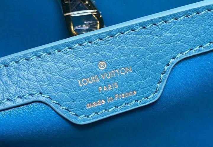 The Capucines Mini replica is fashioned from high-quality, full-grain leather, closely matching the official Taurillon leather used by Louis Vuitton. The hardware is made from durable, polished metal that mimics the original’s finish, ensuring both visual appeal and longevity for daily use or special occasions.