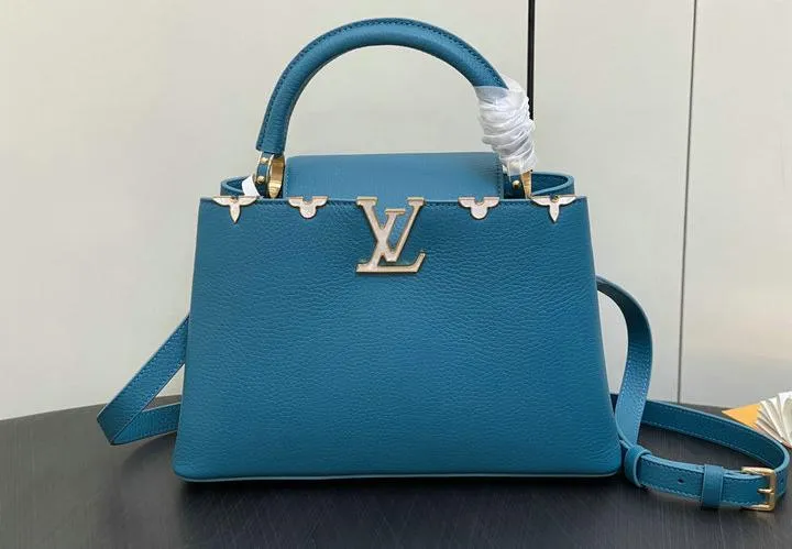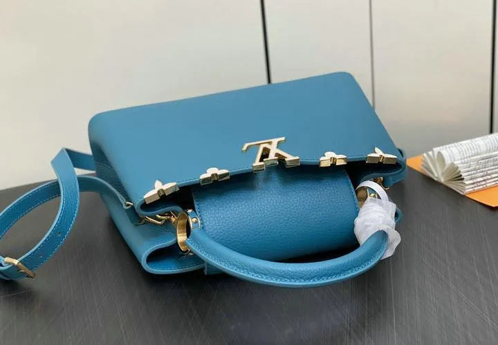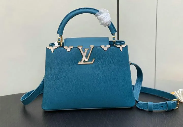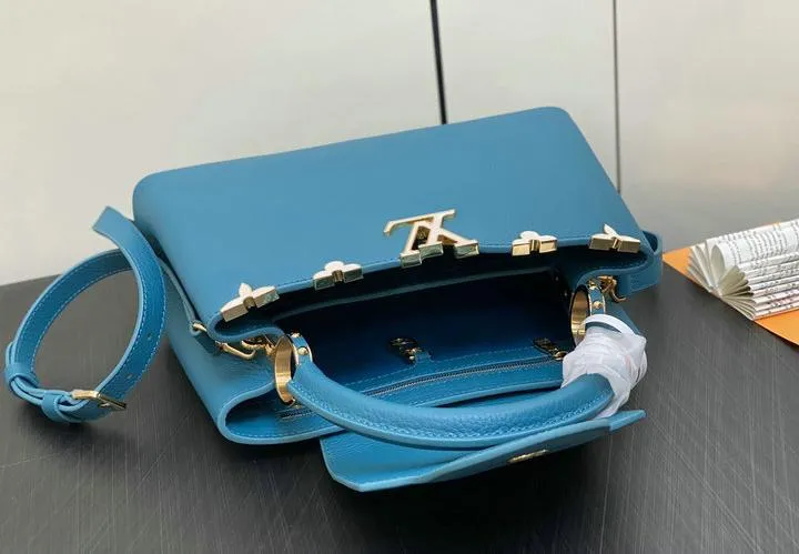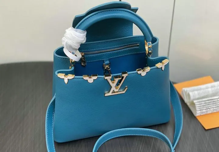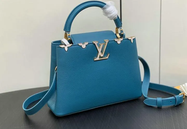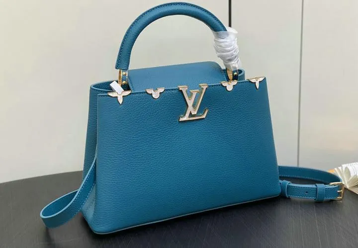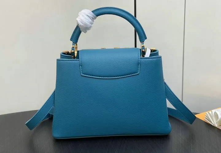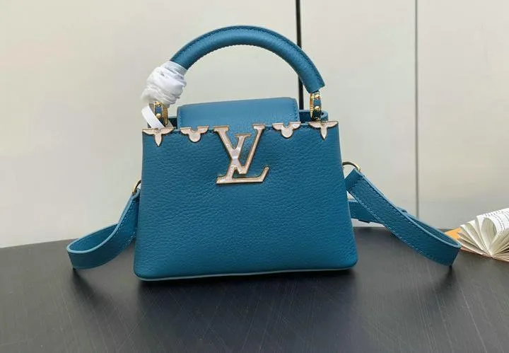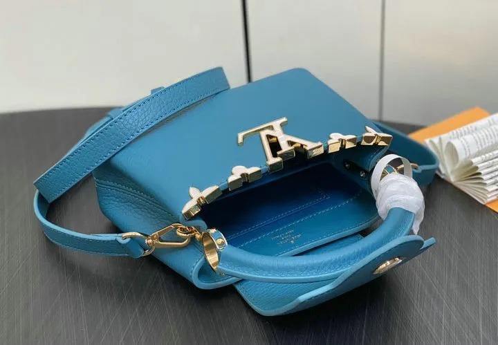 The Capucines Mini replica is fashioned from high-quality, full-grain leather, closely matching the official Taurillon leather used by Louis Vuitton. The hardware is made from durable, polished metal that mimics the original’s finish, ensuring both visual appeal and longevity for daily use or special occasions.