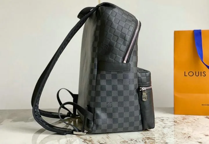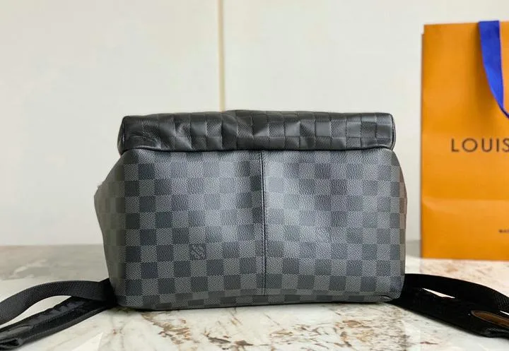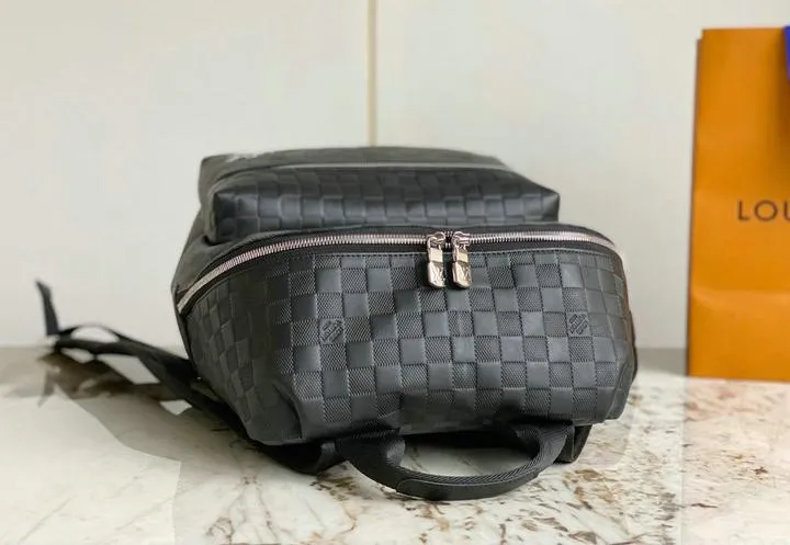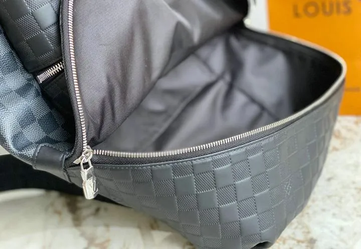 The backpack is constructed from high-quality coated canvas and genuine leather, closely matching the original’s tactile and visual appeal. All metal hardware—including zippers, buckles, and clasps—are crafted from durable, polished metals that mimic the look and weight of the authentic Louis Vuitton fittings for an added touch of realism.