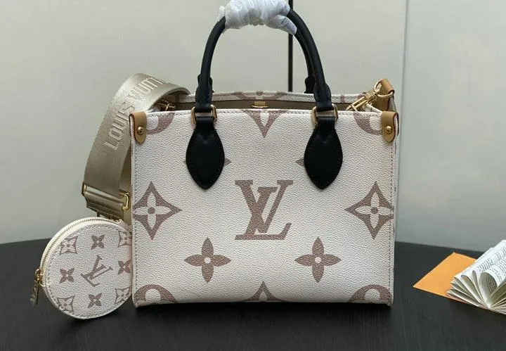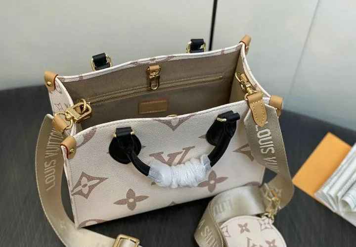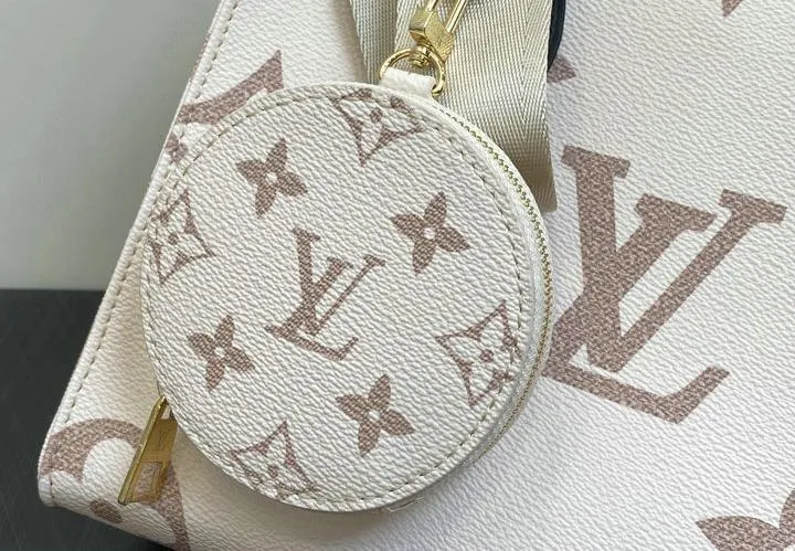 The replica uses premium coated canvas and genuine leather, providing both durability and a luxurious touch. The hardware, including zippers and clasps, is constructed from high-quality metal with a polished finish, ensuring smooth functionality and enhancing the bag’s sophisticated appearance. These materials closely emulate those found in the authentic Louis Vuitton OntheGo PM.