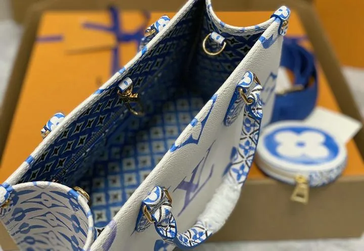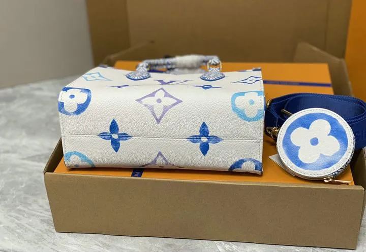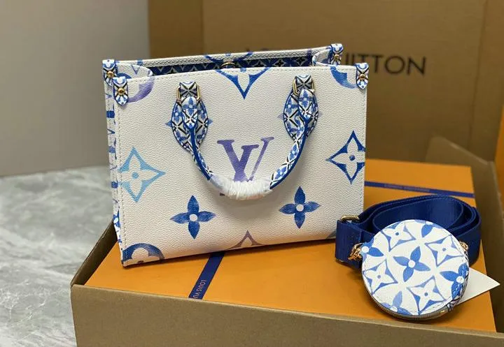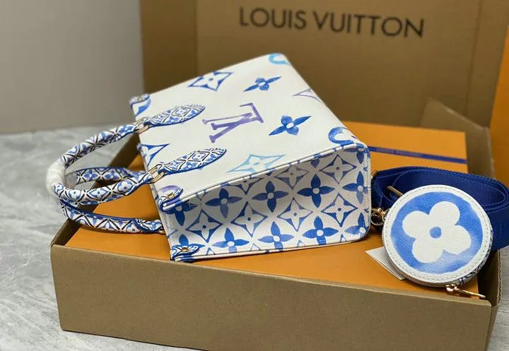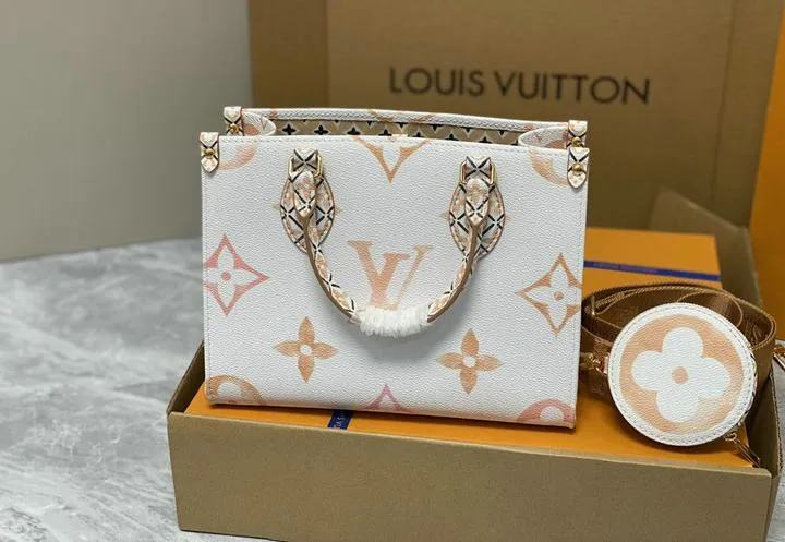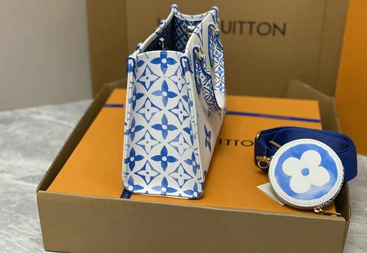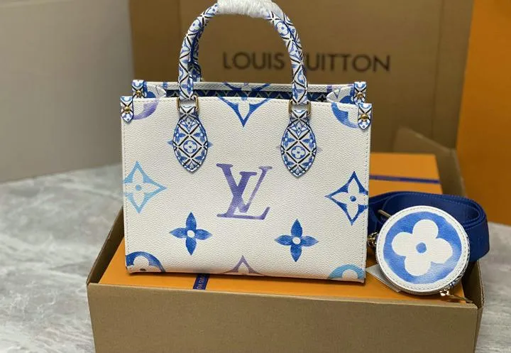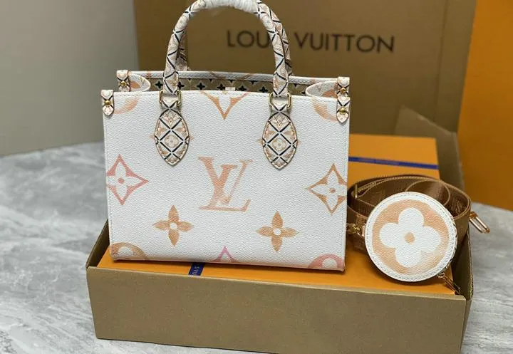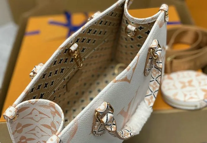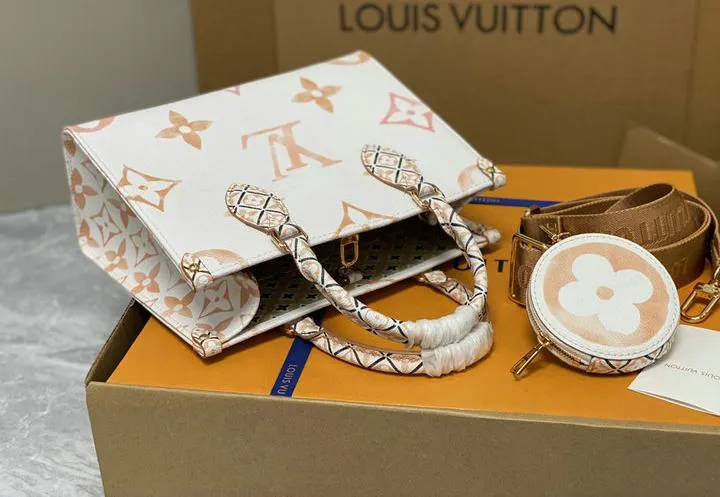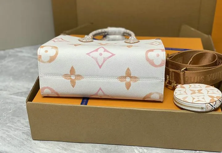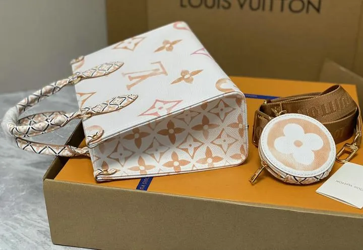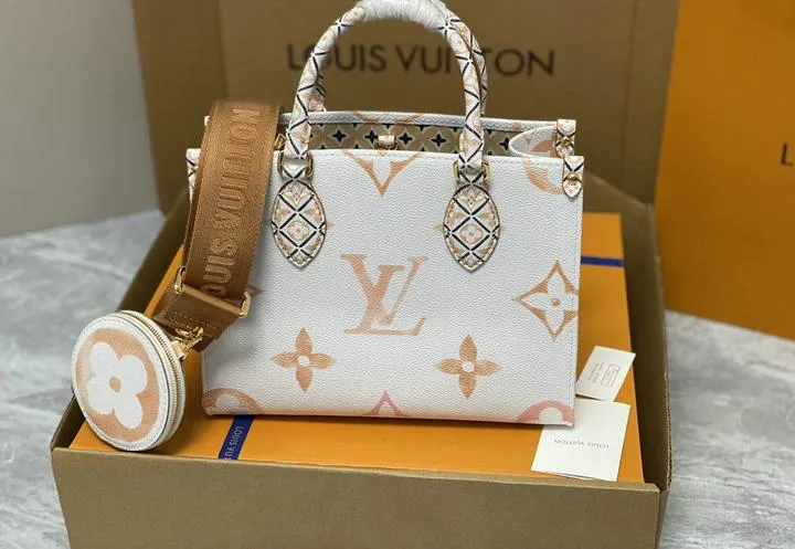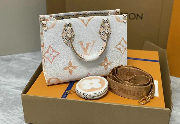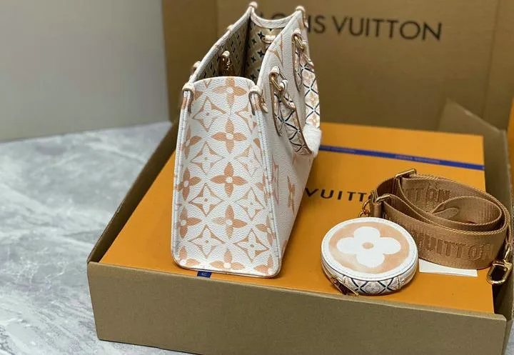 Your OntheGo ships inside a rigid beach-sand-colored box wrapped in coral tissue and tied with aqua ribbon. Inside you will find a cotton dust bag printed with the LV flower, the adjustable canvas strap, matching coin pouch, microfiber polishing cloth, folded care guide, and an NFC card linking to product details. All hardware is protected with low-tack film so the bag reaches you scratch-free and gift-ready.