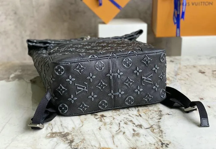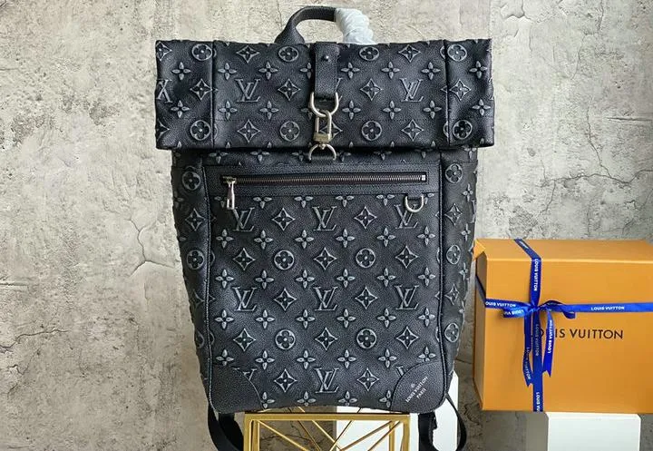 Crafted from premium full-grain cowhide leather, the bag features an embossed Monogram pattern that mirrors the depth and definition of the authentic piece. Hardware—including the roll-top hook, zipper pulls, and strap adjusters—is forged from solid alloy brass and finished in high-polish gunmetal to resist tarnishing. Every component, from edge-paint shade to zipper glide, is selected to recreate the tactile and visual feel of a genuine Louis Vuitton backpack.