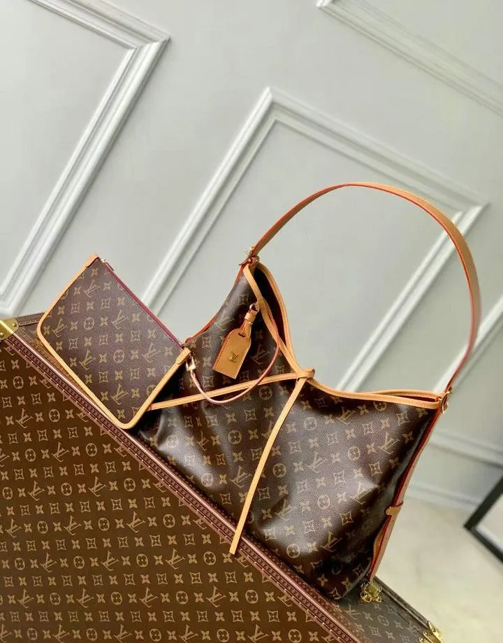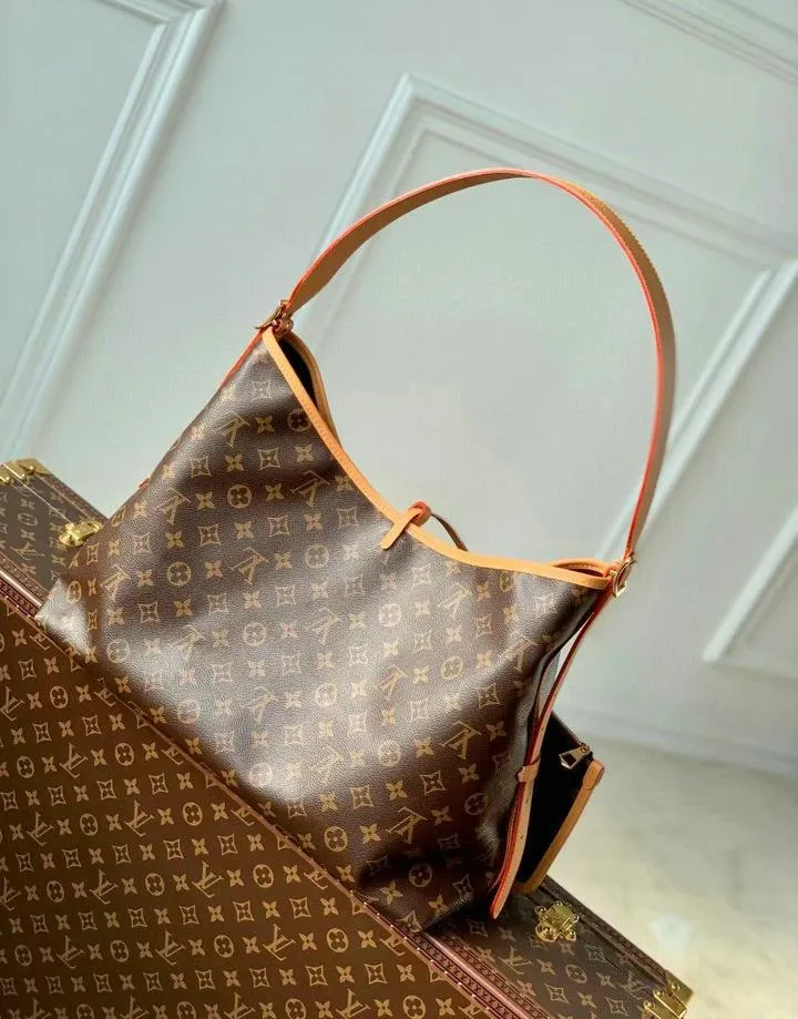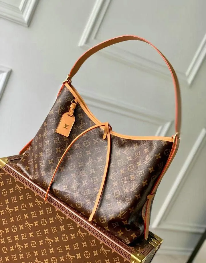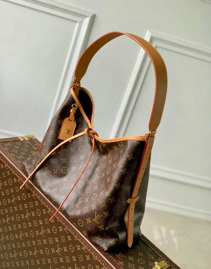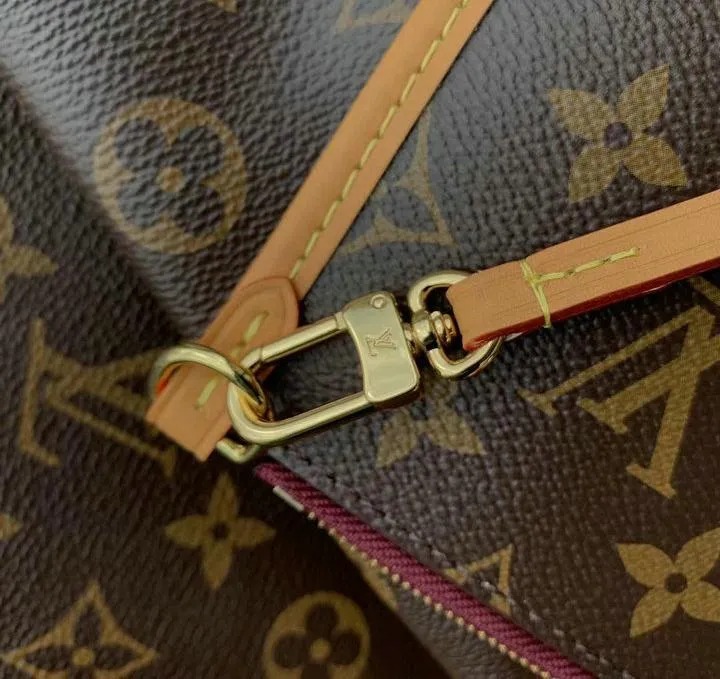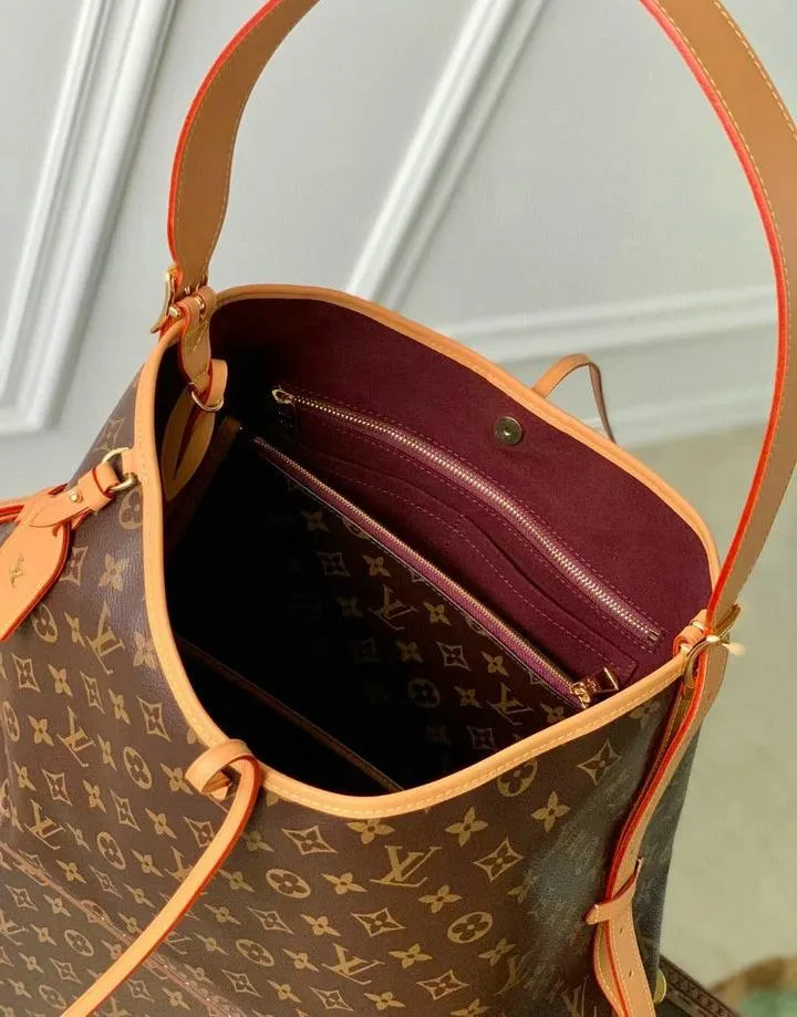 The replica is patterned after Louis Vuitton’s current CarryAll MM, keeping the identical crescent top line, leather-lace draw closure and detachable Monogram pouch. Trim in untreated vachetta is edge-painted burgundy, matching the retail finish, while side piping follows the same curve that makes the original bag easy to recognise.