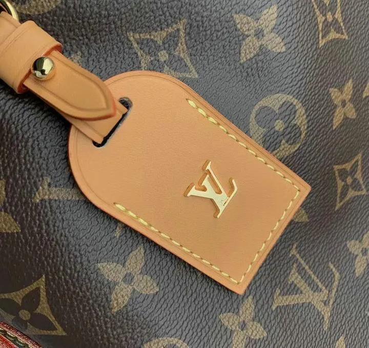 The body is classic Monogram coated canvas paired with aged natural cowhide trim. A burgundy microfiber lining protects delicate items from scratches. All metal parts, from the magnetic clasp to the swivel hooks, are light-gold brass polished to a mirror shine. The name tag and adjustable shoulder strap are cut from the same vachetta for a seamless colour match.