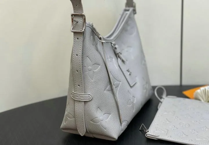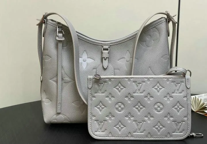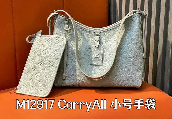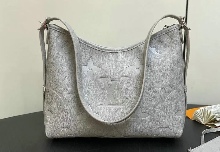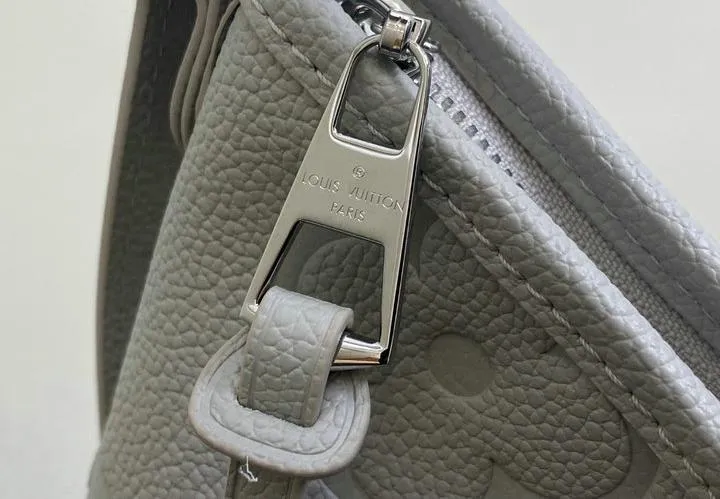 The replica follows the official CarryAll PM pattern, featuring the same Monogram Empreinte embossing, slanted zipper line, and soft crescent silhouette. Stitch spacing, piping placement, and the detachable name tag mirror the boutique bag, so the overall look and feel remain true to the authentic design.
