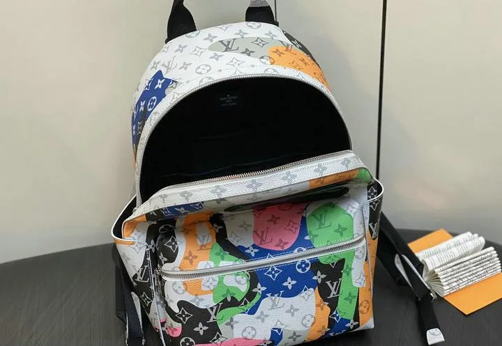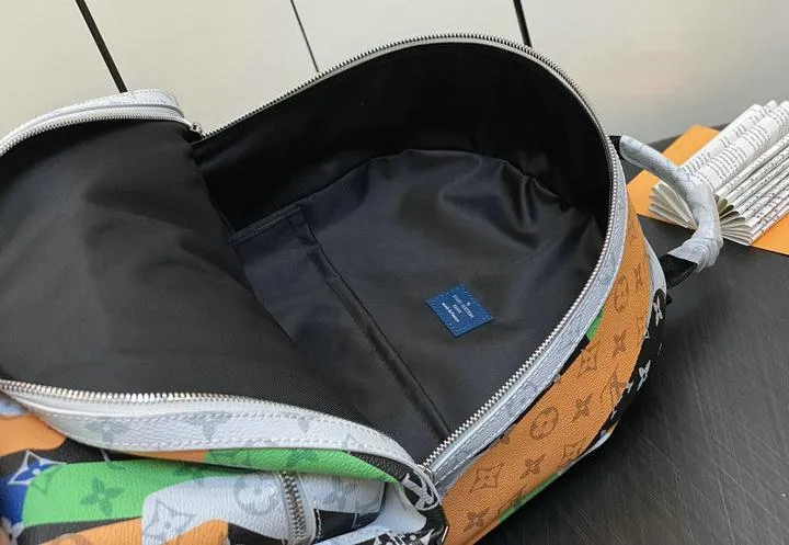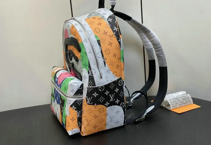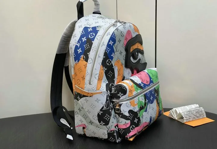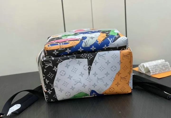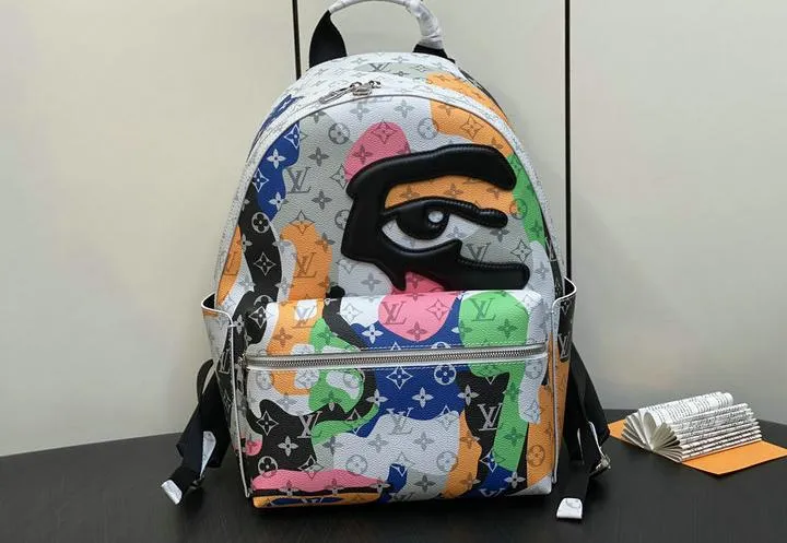 The backpack follows Louis Vuitton’s original pattern, including the full-size Monogram print overlaid with bright abstract panels and the raised black eye patch on the front pocket. Trim placement, zipper shape, and logo embossing on the handle match the boutique version, giving the replica the same standout look from every angle.
