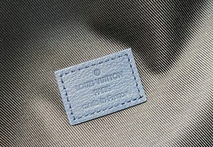 The shell is Monogram Gradient coated canvas that fades from midnight blue to cerulean, laminated to a cotton twill backing for shape memory. Trim on the base, handle, and zip guards is smooth navy cowhide. Lining is ripstop polyester that resists pen leaks. Zippers, rings, and adjuster hardware are solid brass finished in palladium, then clear coated to keep their cool silver tone.