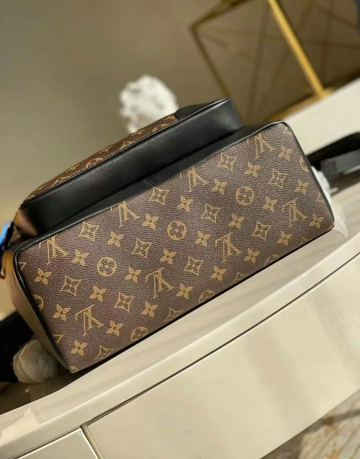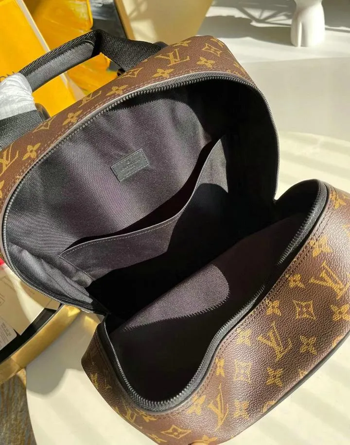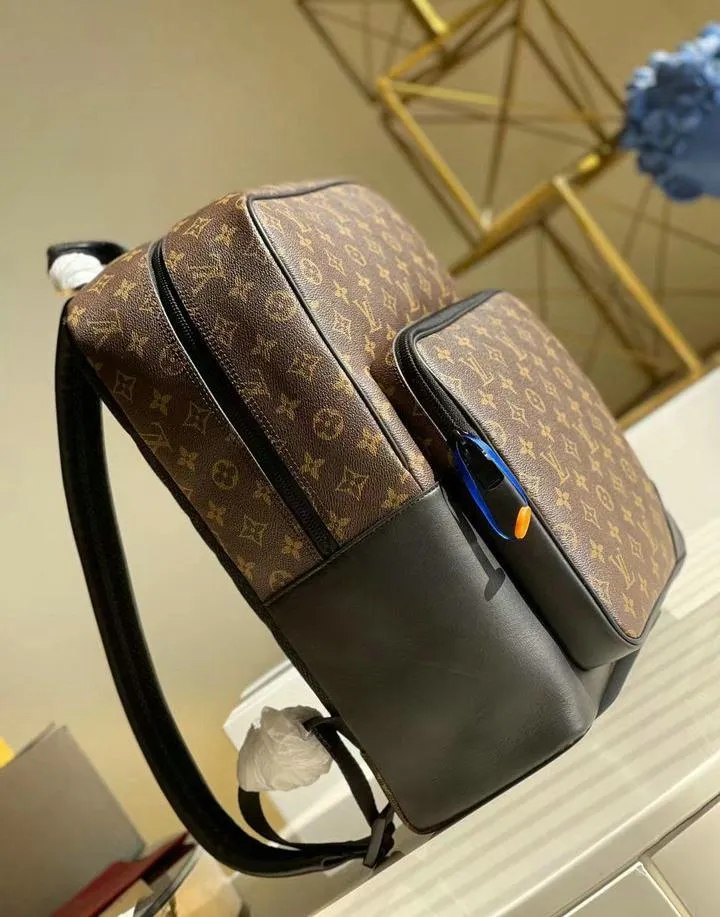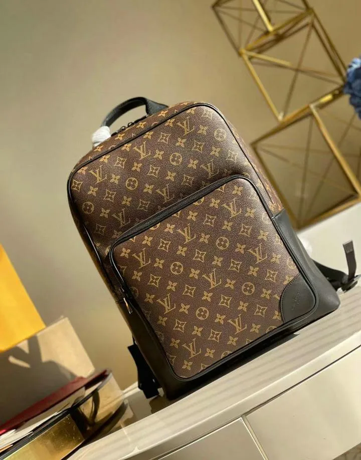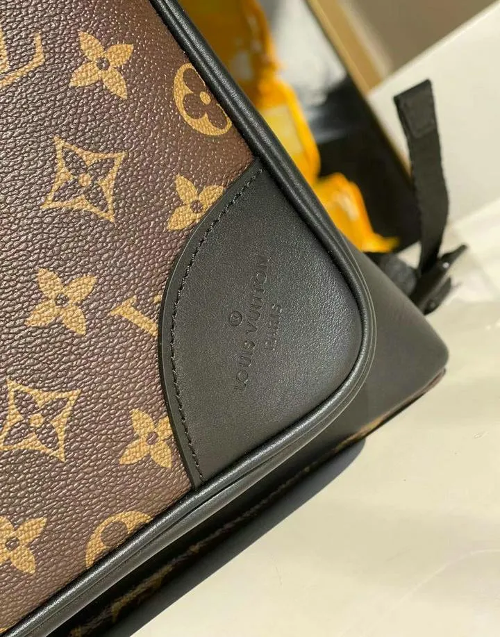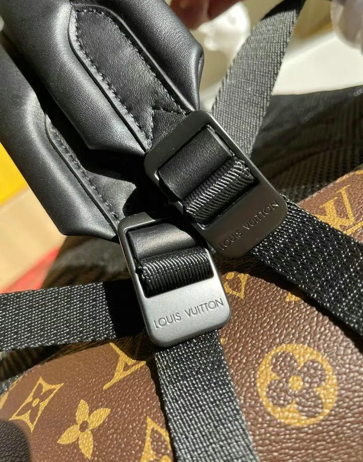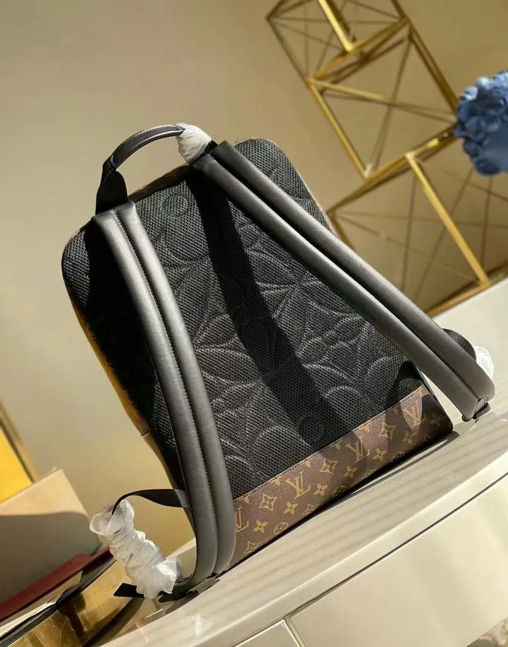 The rep backpack utilizes high-quality coated canvas for the exterior, complemented by genuine leather trim for enhanced durability and luxury. The hardware, such as zippers and buckles, is crafted from sturdy, polished metal that mirrors the finish and feel of the original Louis Vuitton Macassar collection, ensuring both function and a sophisticated appearance.