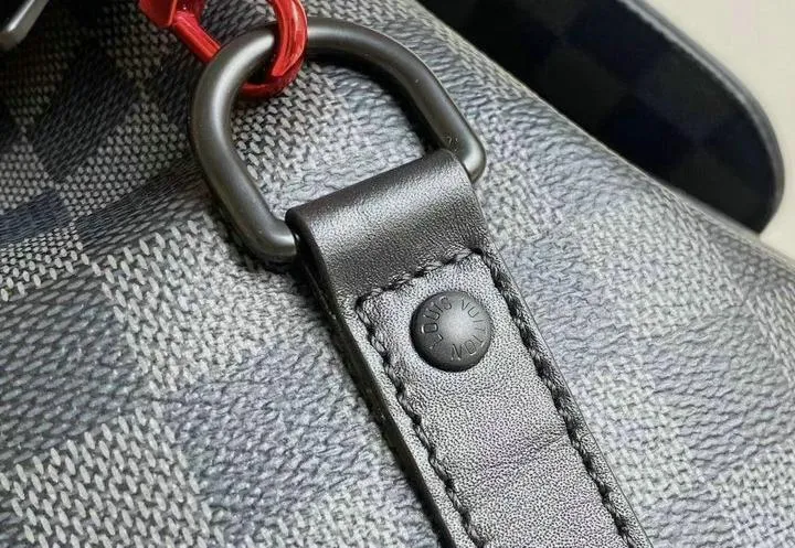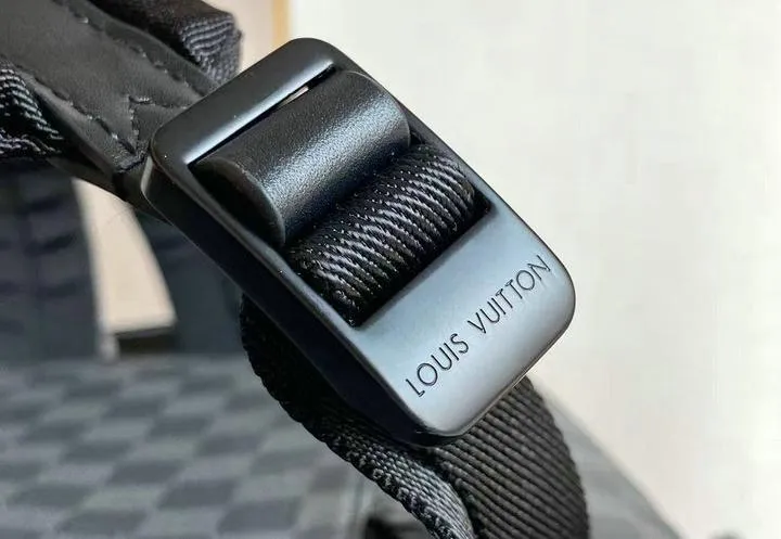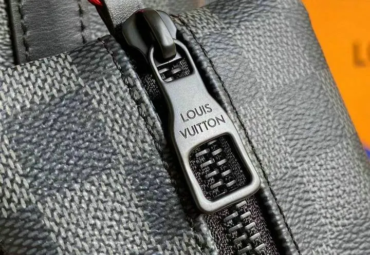 The body is premium coated Damier Graphite canvas laminated to smooth calf leather for structure. Trim—flap, grab handle, strap keepers—is full-grain cowhide edge-painted in charcoal. Hardware is solid zinc–alloy: gun-metal buckles and zips paired with a powder-coated red aluminium D-ring for a modern utility accent. All fittings are laser-engraved with LV logos and built to resist tarnish.