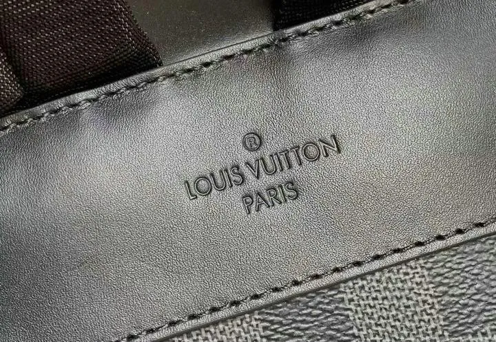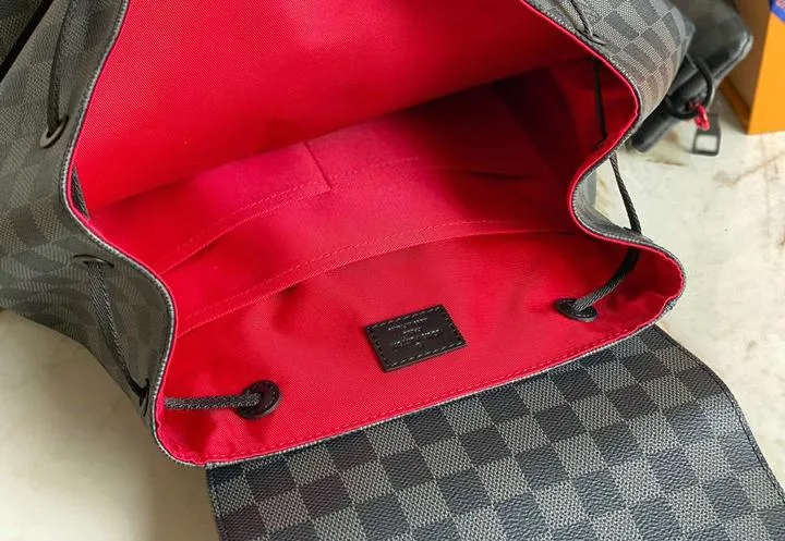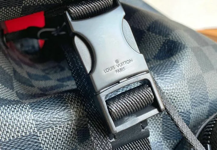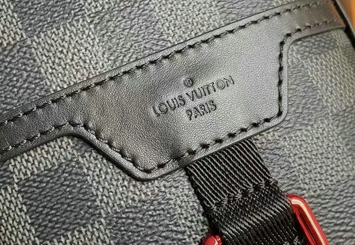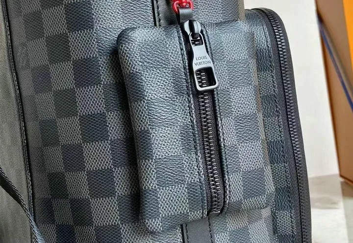 This replica copies the 2024 Damier Graphite Utility down to the twin front cargo pockets, matte-black leather flap, and signature pop of red metal on the left pocket D-ring. Checkerboard alignment, stitch density, and LV heat-stamps on the leather draw-cord match the brand’s own CAD files, so the bag feels virtually identical beside the authentic release.