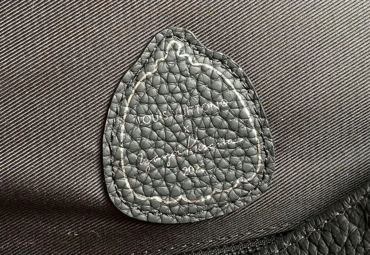 The base is full-grain calf leather tanned to a deep matte black. A multi-layer UV ink-jet process applies the Kusama dots, then a protective micro-coating seals the surface to resist scratching and colour fade. All hardware—front hook, side-pouch buckles, and draw-cord eyelets—is die-cast brass finished in gun-metal black with laser-engraved LV logos.