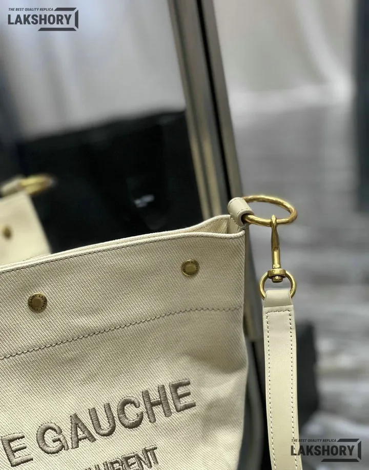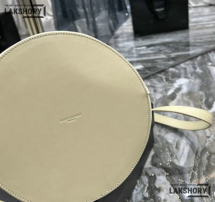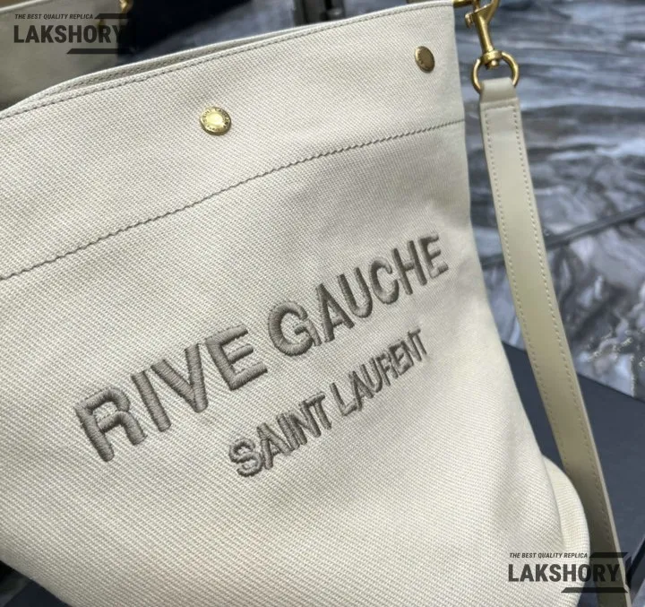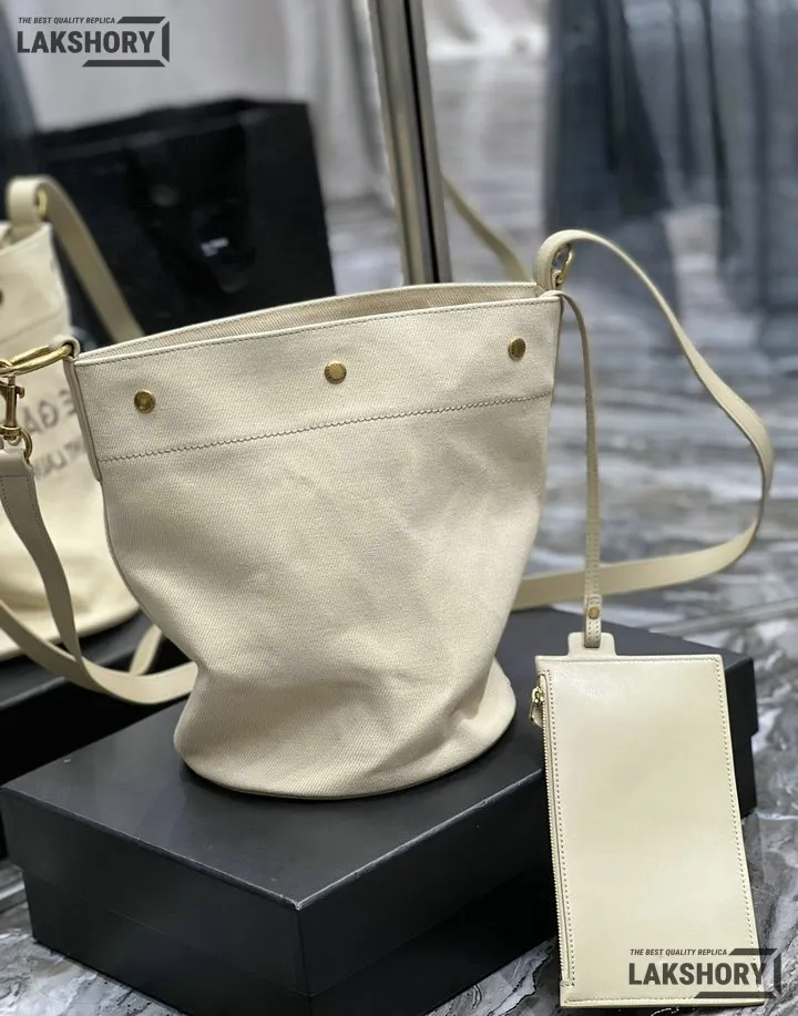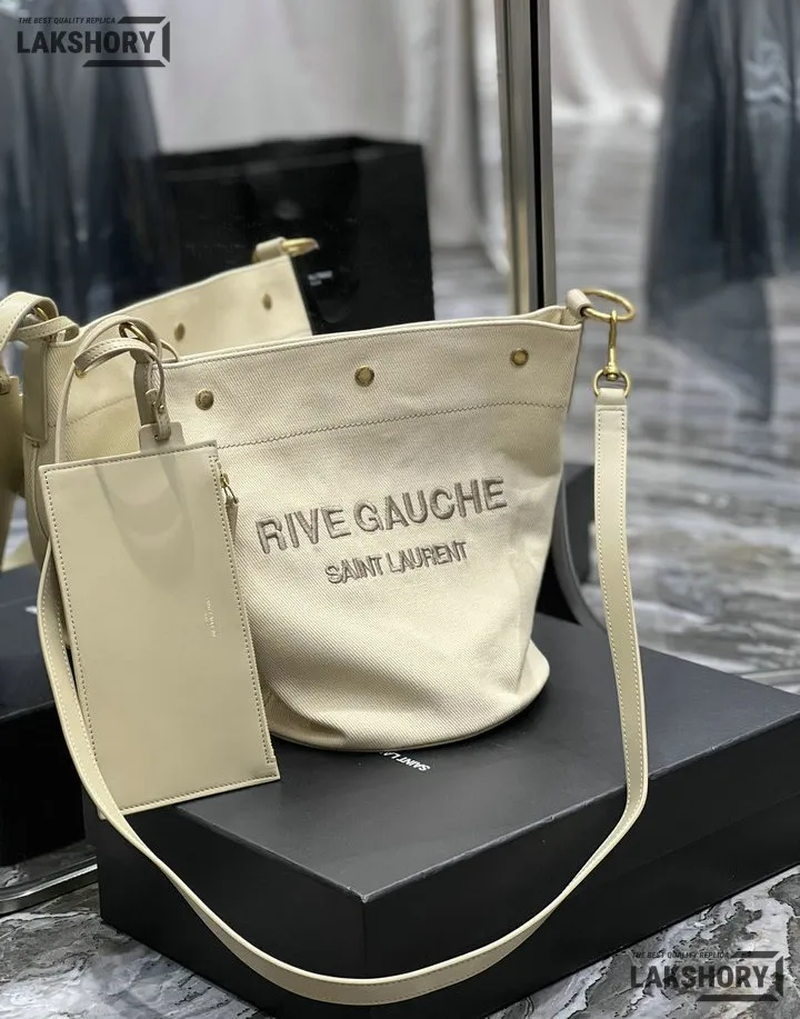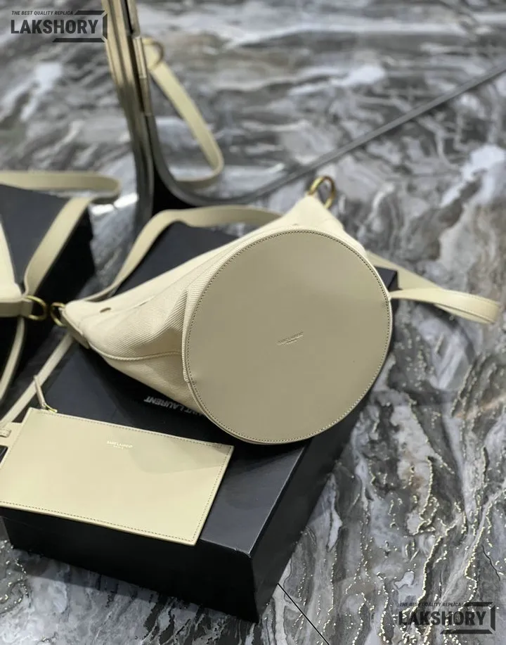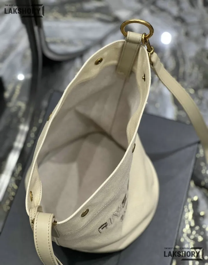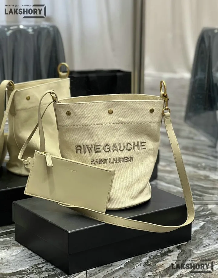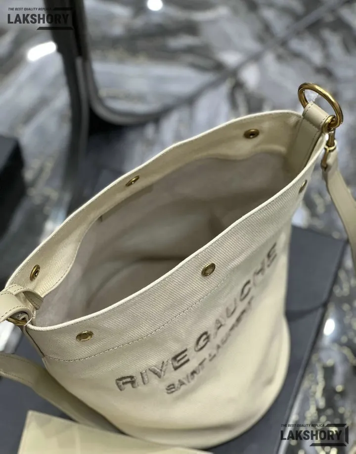 YSL 1:1 Mirror Replica Calfskin Linen Rive Gauche Bucket Bag Beige 20CM/7.9IN