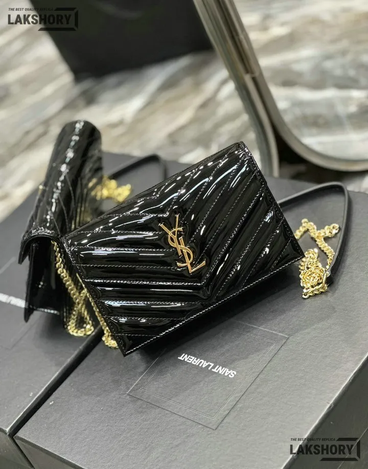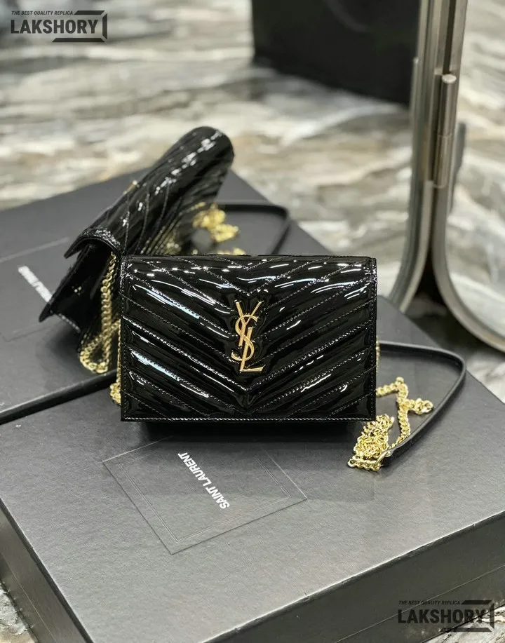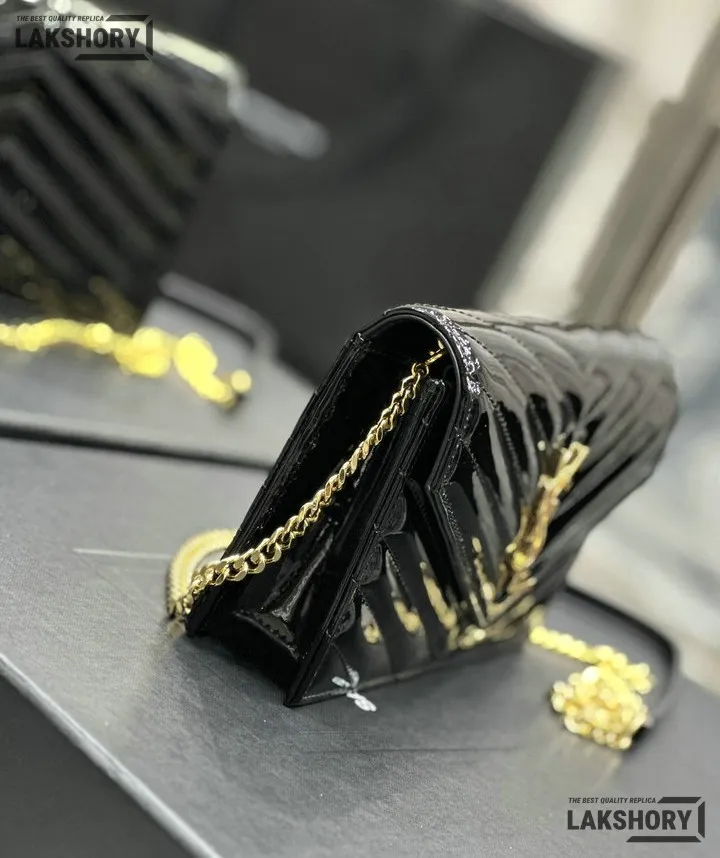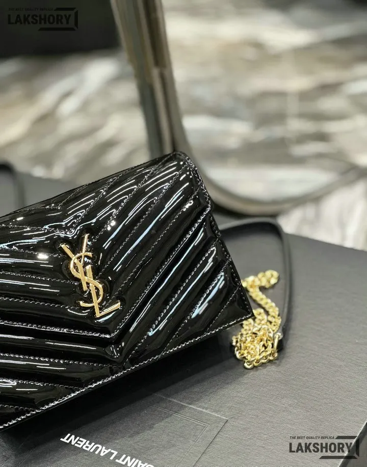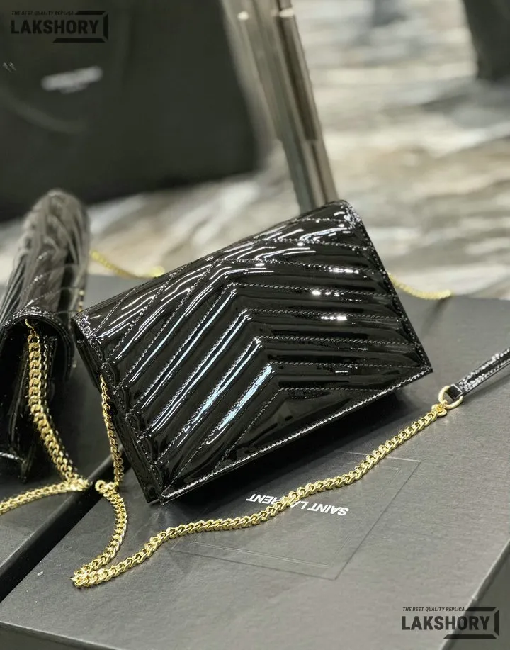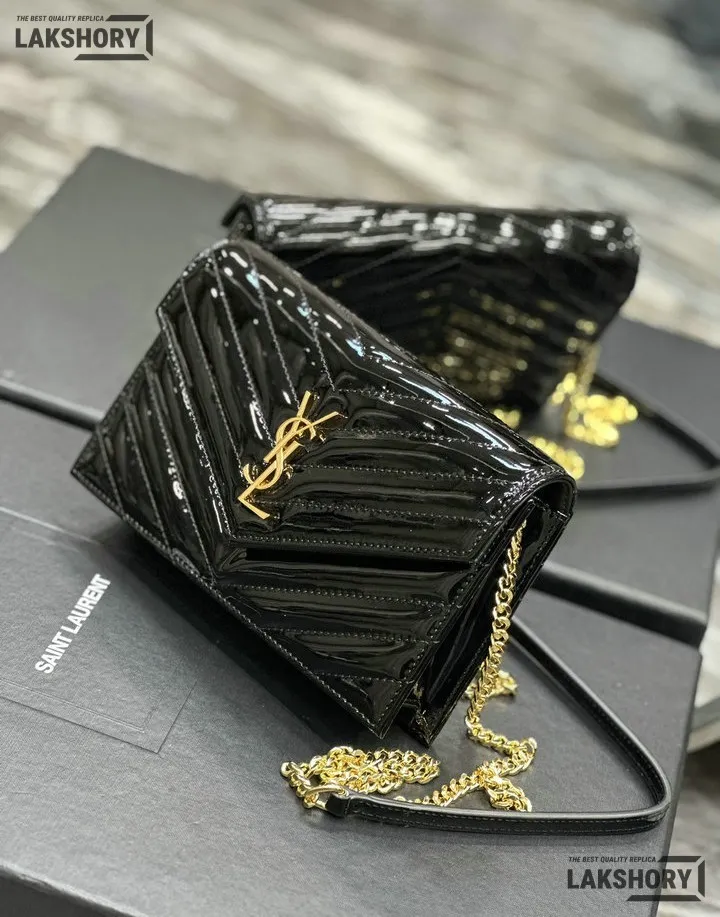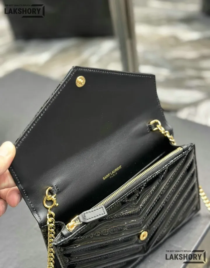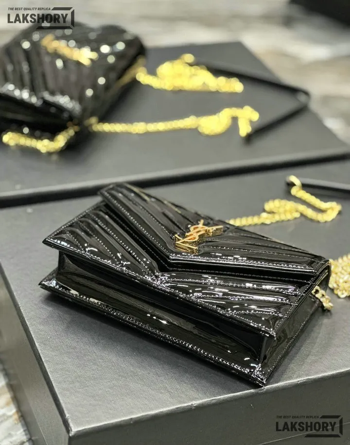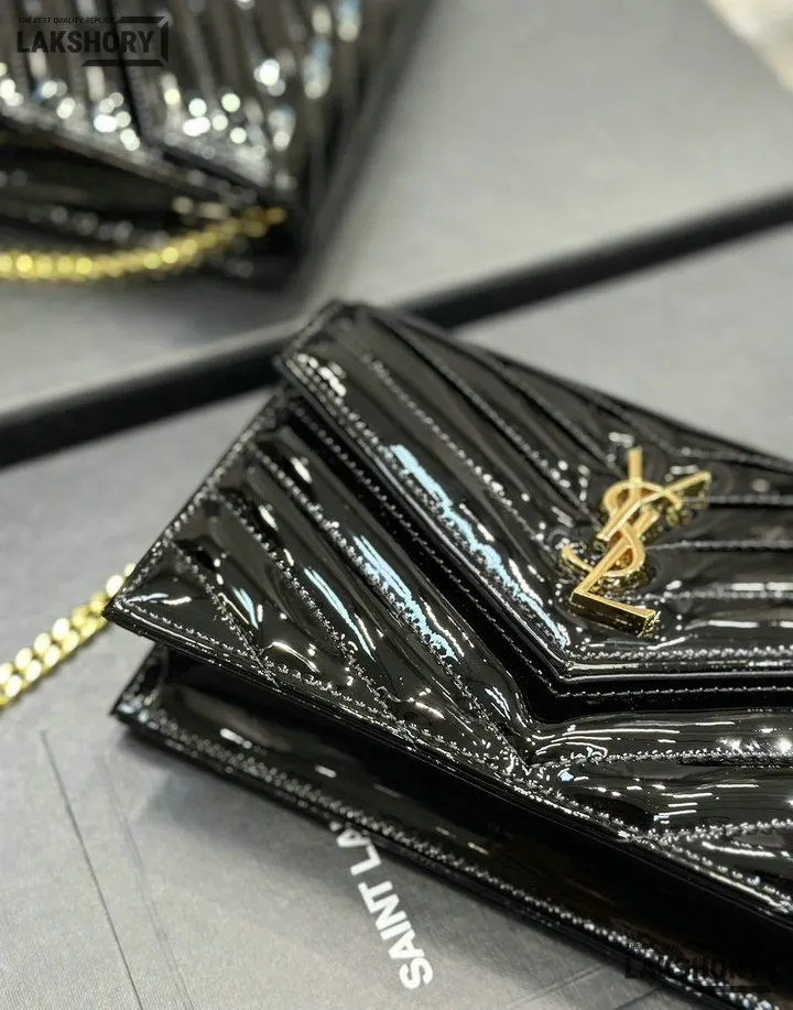 YSL 1:1 Mirror Replica Patent Matelasse Envelope Chain Wallet Black 19CM/7.5IN