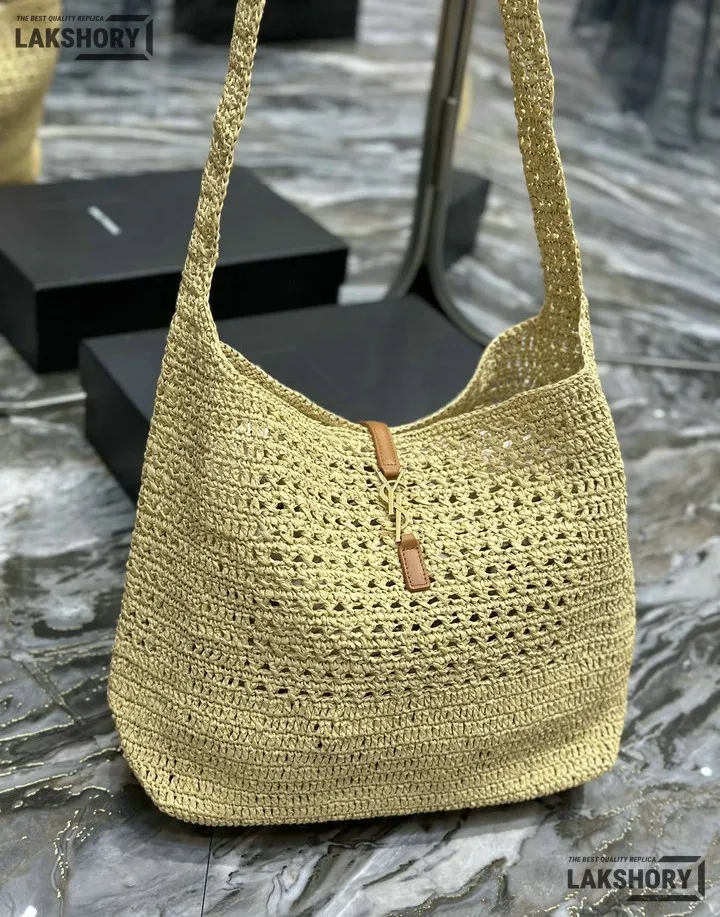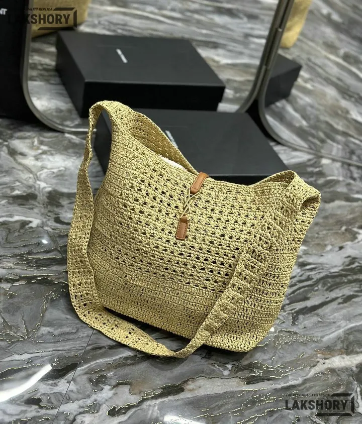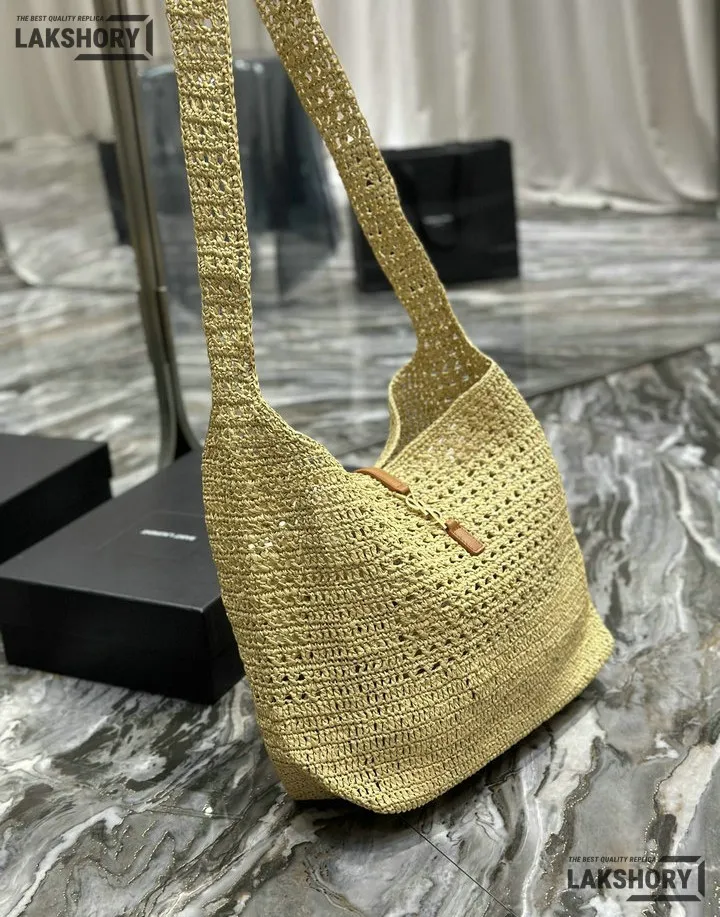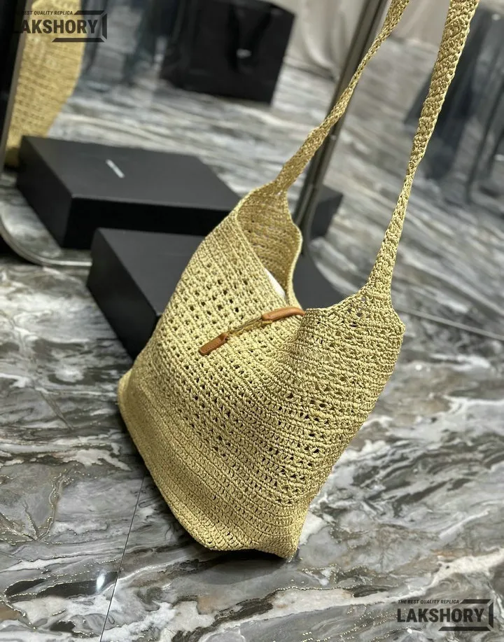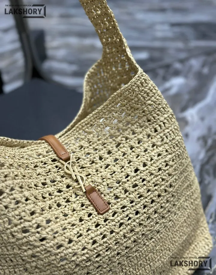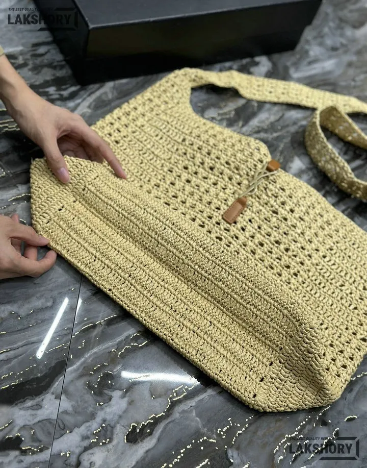 YSL 1:1 Mirror Replica Plaque Raffia Crochet Tote Bag Beige 37CM/14.6IN