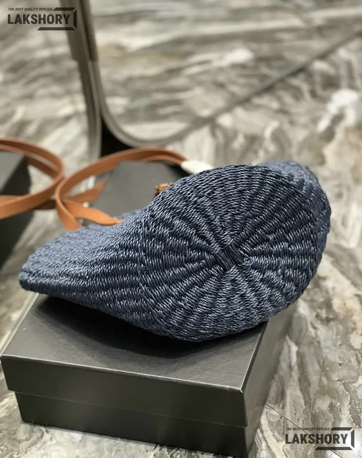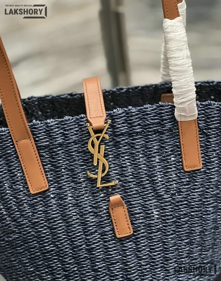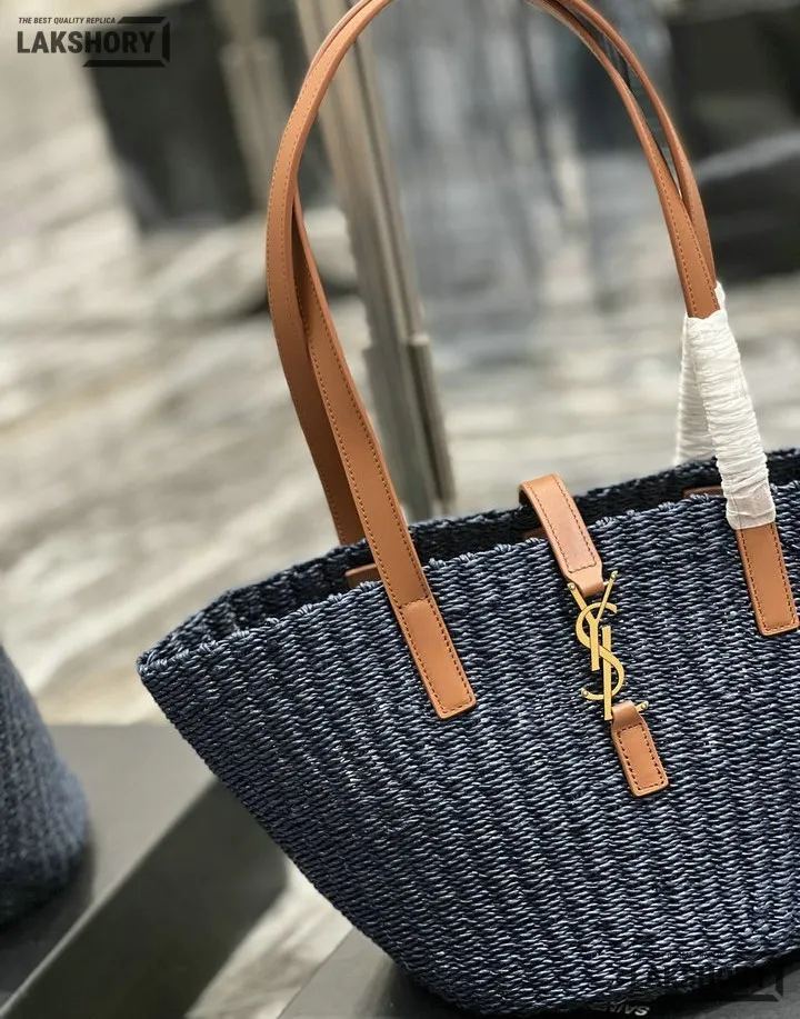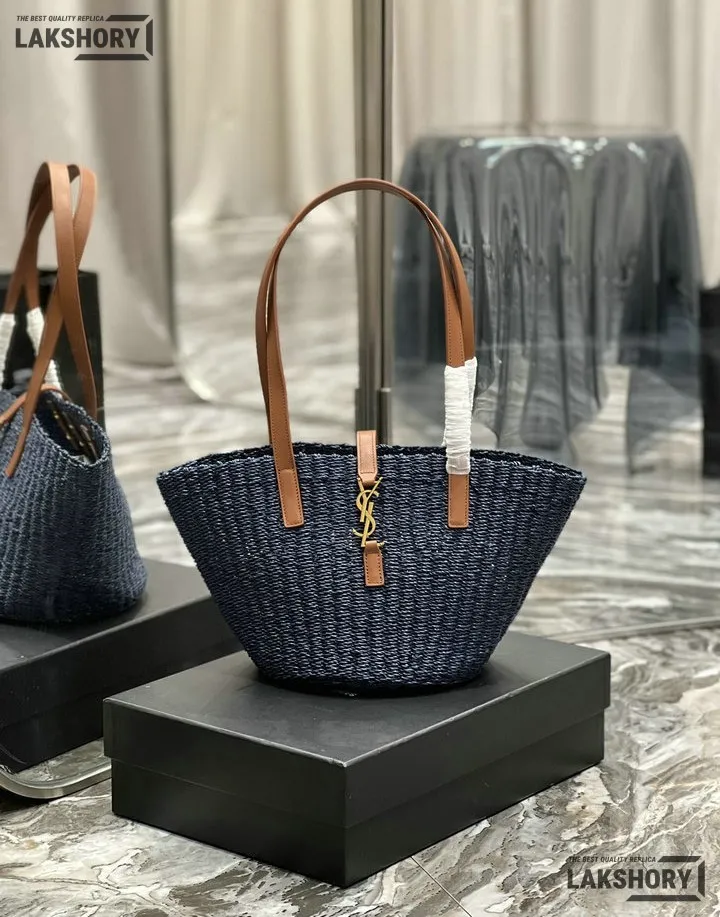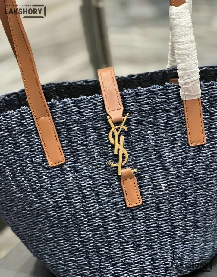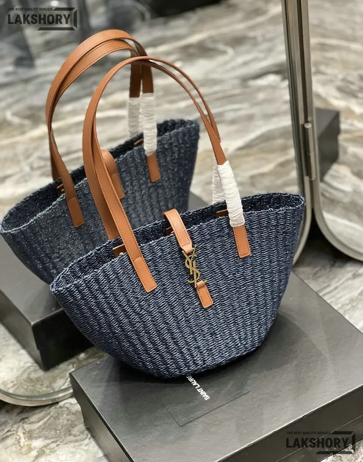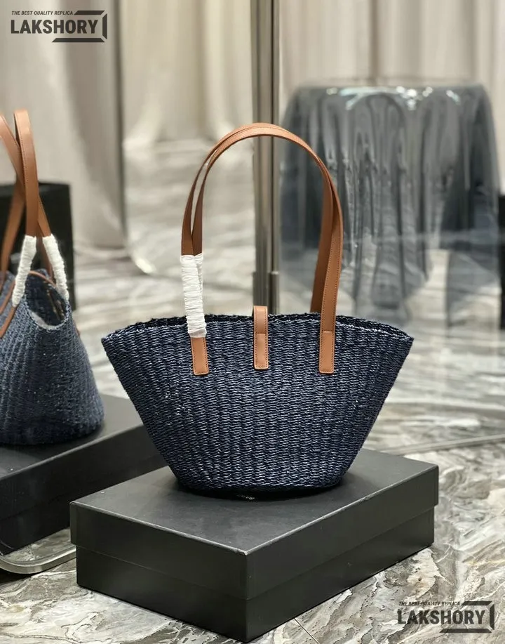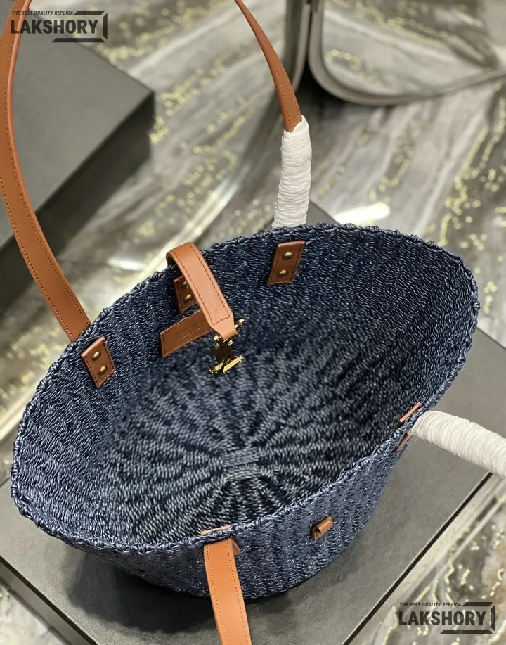 YSL 1:1 Mirror Replica Raffia Calfskin Large Panier Tote Blue 42CM/16.5IN